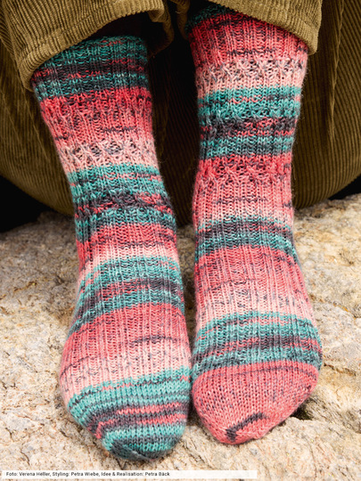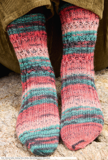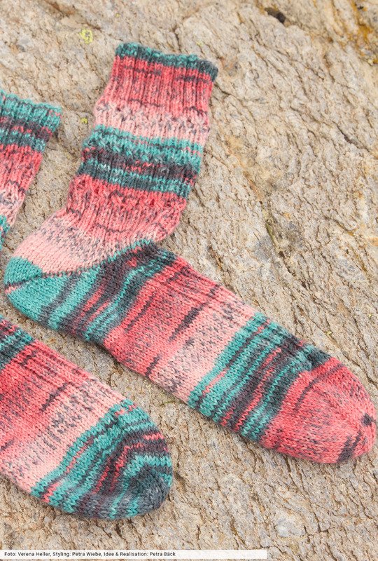 Macht Euch auf die Socken! Zum Beispiel mit diesen hier: Sie begeister nicht nur durch ihren interessanten Farbverlauf von Petrol über Rosa bis hin zu Koralle, sondern auch durch die strapazierfähige Wolle, die ein Statement für Nachhaltigkeit darstellt. Das Muster ist nicht schwer: Rippenstrukturen aus rechten und linken Maschen werden von Zeit zu Zeit miteinander verkreuzt – das schaffen auch weniger versierte Strickerinnen.