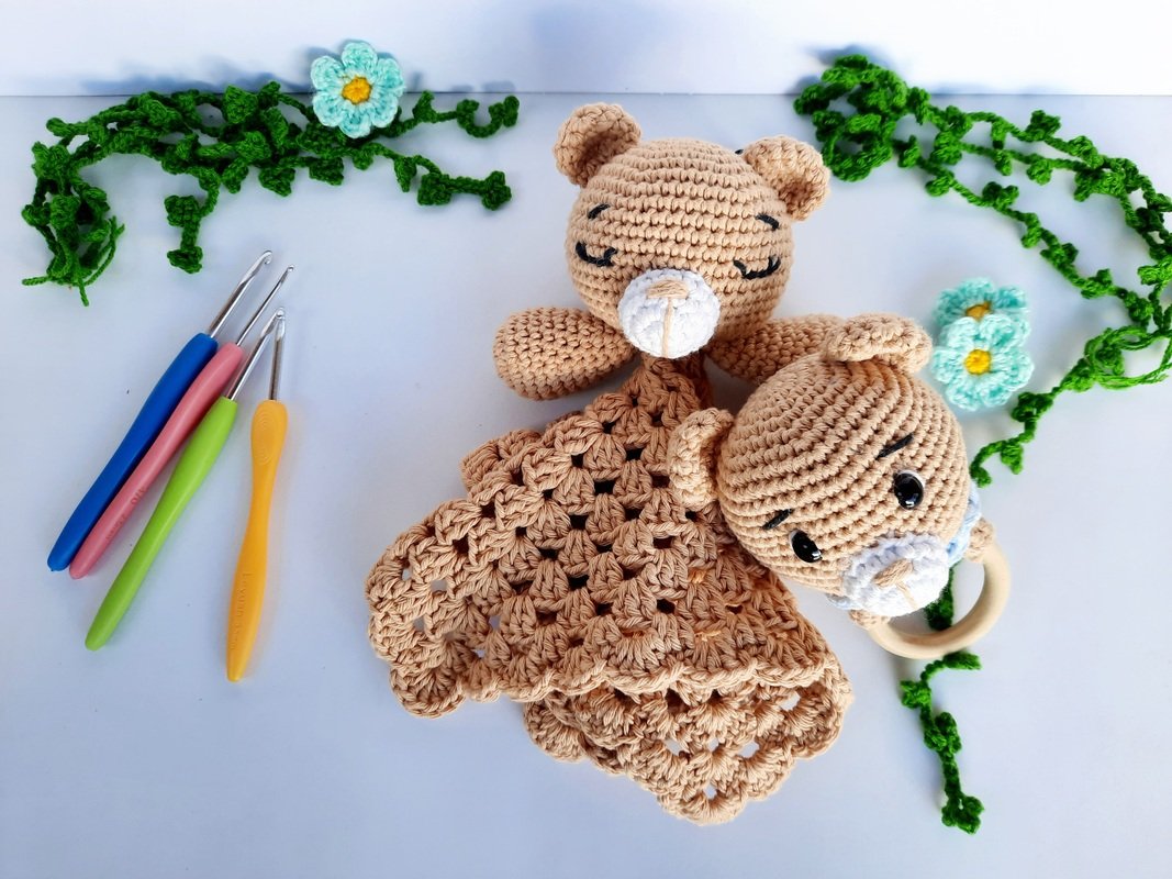 Entdecken Sie Niedlichkeit und Funktionalität mit unserem Häkelmuster für eine Teddybär-Rassel- und Kuscheldecke!