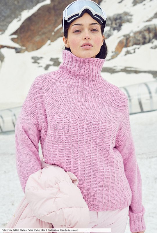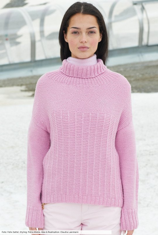 Anfängerleicht, aber trotzdem sehr apart: Bei diesem Pulli sind es einfache Strukturen aus rechten und linken Maschen, die sich stilvoll in Szene setzen. Gestrickt wird aus einem hochwertigen Mischgarn, das sich aus Schurwolle und Seide zusammensetzt – eine Kombination, die in zartem Rosé besonders apart zur Geltung kommt. Die Ärmelschrägungen haben wir gleich nach dem Bund ganz raffiniert platziert – nämlich sichtbar in der Ärmelmitte.