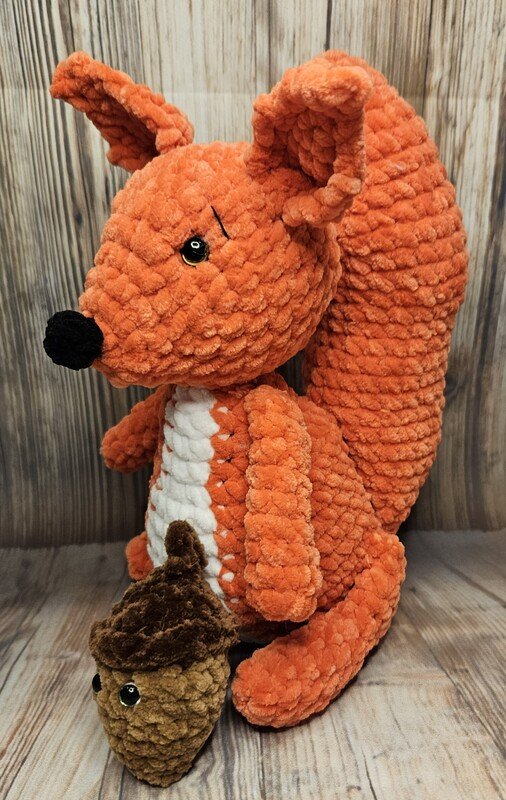 Mit der angegebenen Wolle und mit einer Nadelstärke von 5,5mm wird das Eichhörnchen eine Größe von ca. 23cm und die Eichel von ca. 9cm haben. Bitte beachtet, dass die Größe variieren kann.