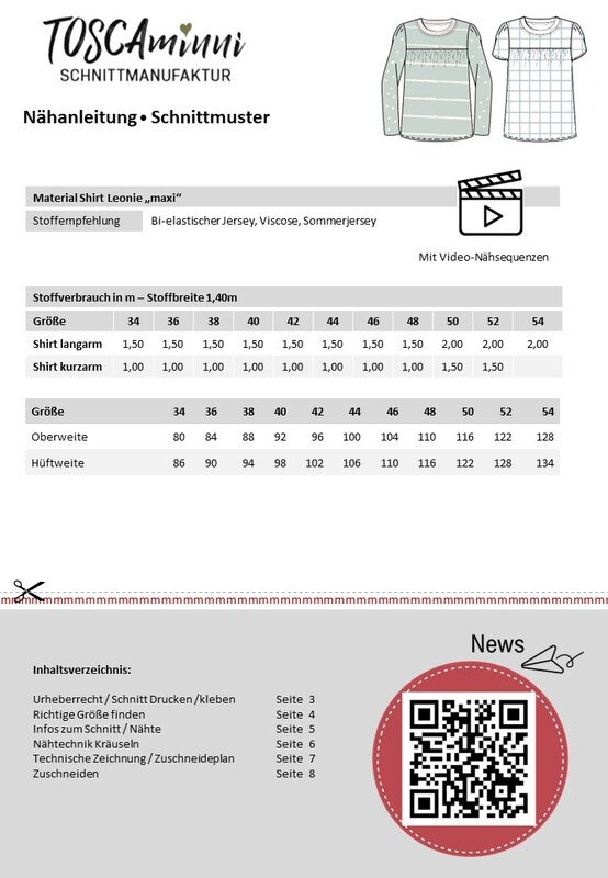 Mit dem Schnittmuster Leoni nähst Du ein vielseitiges T-Shirt, das Du nach Deinen Wünschen mit kurzen oder langen Ärmeln gestalten kannst. Das Besondere an diesem Shirt ist das Vorderteil: Es wird mit einer Passe genäht, während der untere Teil gerafft ist. Diese Kombination verleiht dem Shirt eine legere und feminine Ausstrahlung.