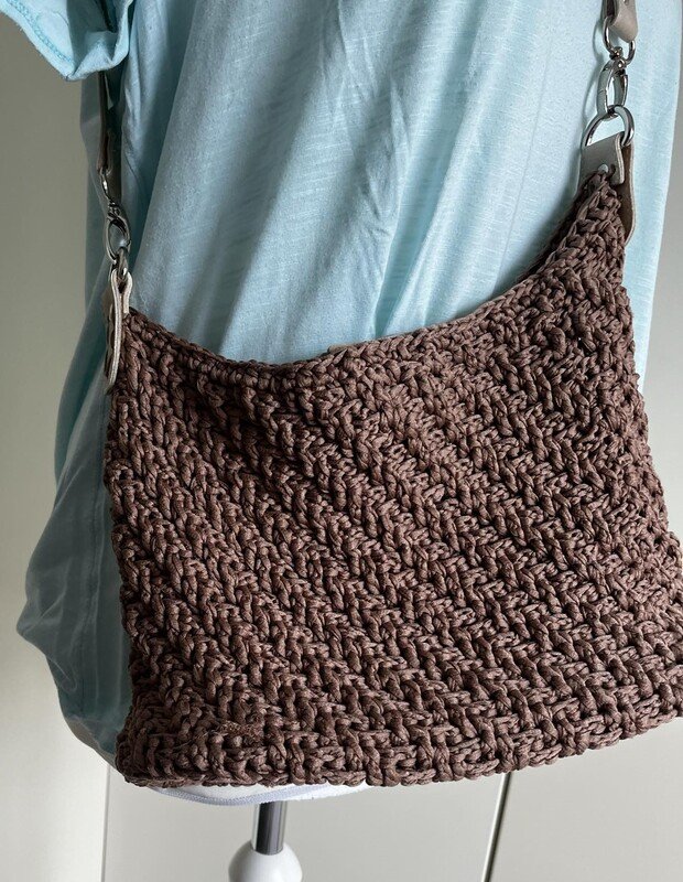 Die Tasche ist etwa 30cm breit, 12cm tief und etwa 40 cm hoch. Bei Verwendung von Alternativgarn kann die Höhe der Tasche abweichen. Breite und Tiefe sind vom verwendeten Taschenboden abhängig.