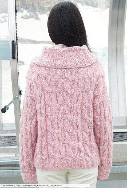 Handgestrickte Maschen sind unübertrefflich bequem und unnachahmlich lässig. Dies gilt besonders für diesen Pulli, dessen fast dreidimensional wirkende Zopfstreifen Blicke auf sich ziehen. Dazu das weiche Alpakamischgarn, die gemütliche Oversizeform und die freundliche Rosa-Nuance – fertig ist ein Lieblingsstück, das länger als eine Saison begeistert. Elastische Rippenbündchen und der locker fallende, nach außen umgeschlagene Rollkragen bilden das Finish.
