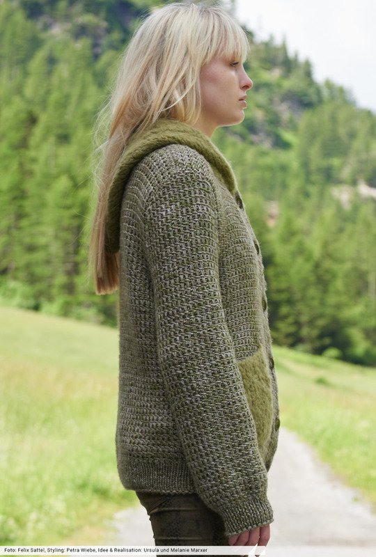 Grünmelierte Schurwolle bildet die Grundlage für eine Jacke, die sich mutig auf alle Abenteuerwege begibt. Das Webmuster geht nach etwas Übung schnell und einfach von der Nadel, die aus einem bauschigen Alpakagarn gearbeiteten Taschen werden zum Schluss aufgenäht, die Kapuze an den Halsausschnitt gestrickt. Das stilvolle Finish bilden die leicht schimmernden Metallic-Knöpfe, die du direkt bei der Firma bestellen kannst.