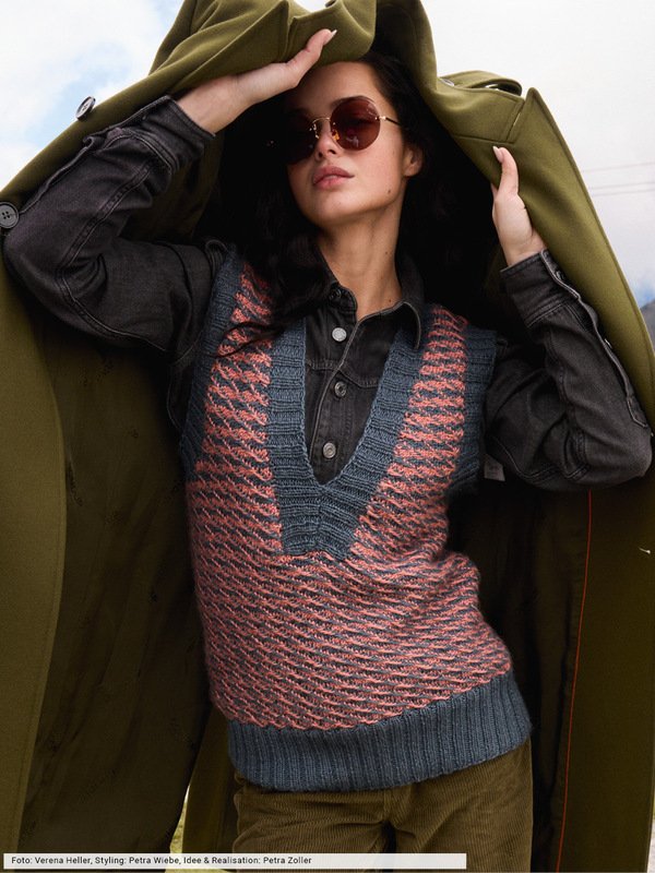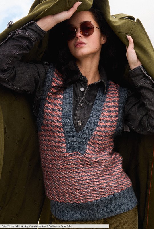 Schon im letzten Winter waren sie die absoluten Highlights und haben auch in dieser Saison nichts an Attraktivität eingebüßt: Pullunder in allen Variationen. Dieser hier begeistert durch ein Webmuster, bei dem Maschen abgehoben und der unbenutzte Faden vor der Arbeit mitgeführt wird. Ein toller Effekt, der zweifarbig besonders reizvoll zur Geltung kommt. Breite Rippenblenden am Saum, an den Armausschnitten und den Ausschnittkanten bilden den Rahmen.