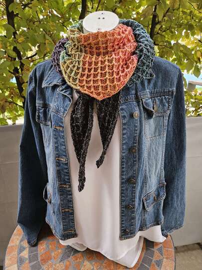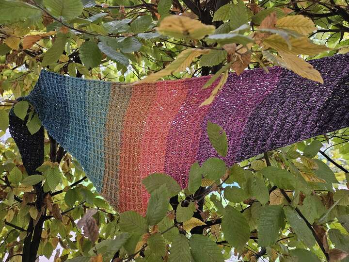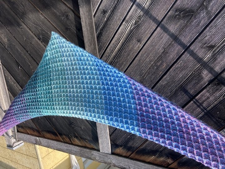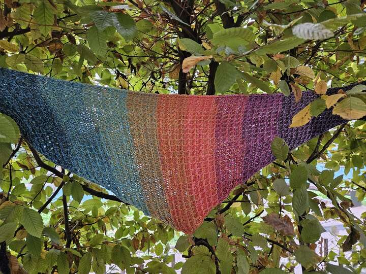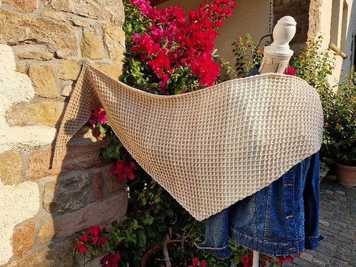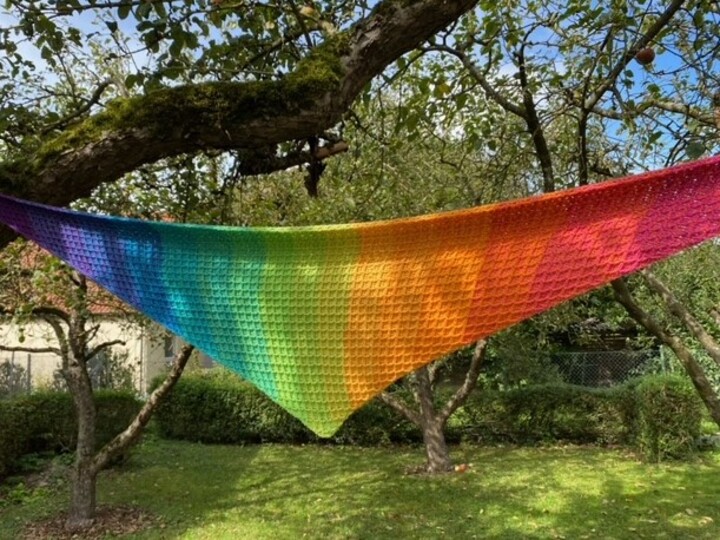 Das Tuch kann in beliebiger Größe gearbeitet werden. Nach der Hälfte des Garns bzw. nach der Hälfte deiner Wunschgröße häkelst du einfach wieder retour.