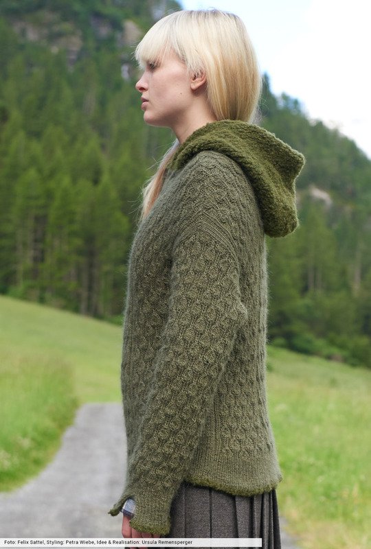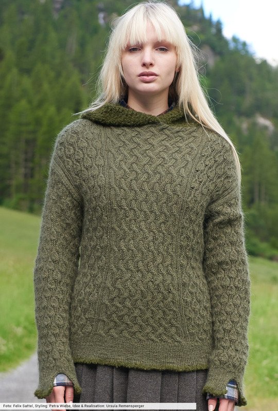 Bei diesem sportlichen Hoody kommt das glatte Alpakagarn in Olivgrün für den Korpus mit tollen Zopf- und Blattstrukturen zum Einsatz. Die farblich abgestimmten Bouclé-Effekte hingegen setzen sich bei der Kapuze und als schmale Abschlusskanten für die Bündchen in Szene. Wir finden, eine tolle Kombination, die Individualität mit Tragbarkeit verbindet und dich länger als eine Saison begeistern wird.
