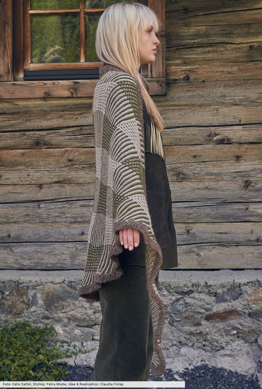 Wie ein Plaid wirkt dieses große Tuch, das wir mit großzügigen Karostrukturen in zweifarbiger Hebemaschentechnik ausgestattet haben, für das du in unserer Anleitung eine genaue Beschreibung findest. Die anschmiegsame Haptik wird durch ein edles Alpaka-Seidengarn erzeugt, das an den abgerundeten Kanten durch schmale Blenden aus Bouclégarn kombiniert wird. Auch bei der modischen Hüfttasche kommt dieses Garn zum Einsatz. Die passenden Zutaten wie Reißverschluss, Canvas-Riemen und Schnalle findest du im Bastelbedarf.