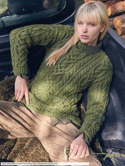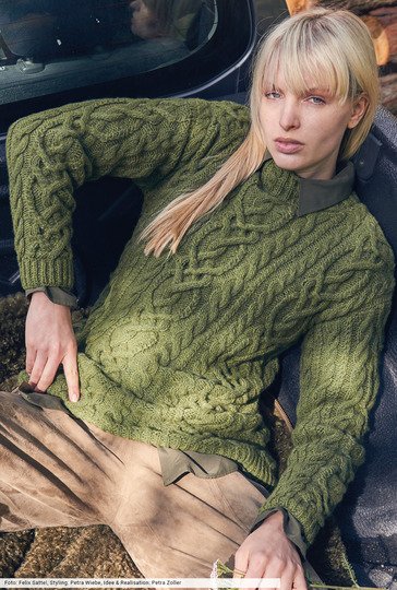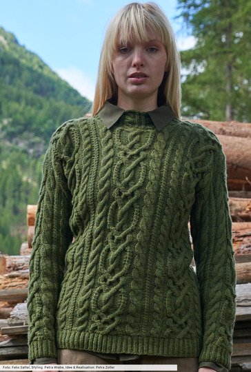 Klassisch anmutende Musterpullis sind aus der Maschenmode nicht wegzudenken. Hier sind es verschlungene Zopfstreifen, die mit schmaleren Zöpfen eingerahmt werden. Ein Stück für's Leben, bei dem wir nicht mit edlen Fasern gespart haben. Denn die hochwertige Lammwolle verspricht Nachhaltigkeit auf der ganzen Linie und behält ihre Vitalität und Beständigkeit. Die Bündchen werden im Halbpatent gearbeitet, ebenso die Halsblende, bei der wir noch Zopfstreifen hinzugefügt haben.