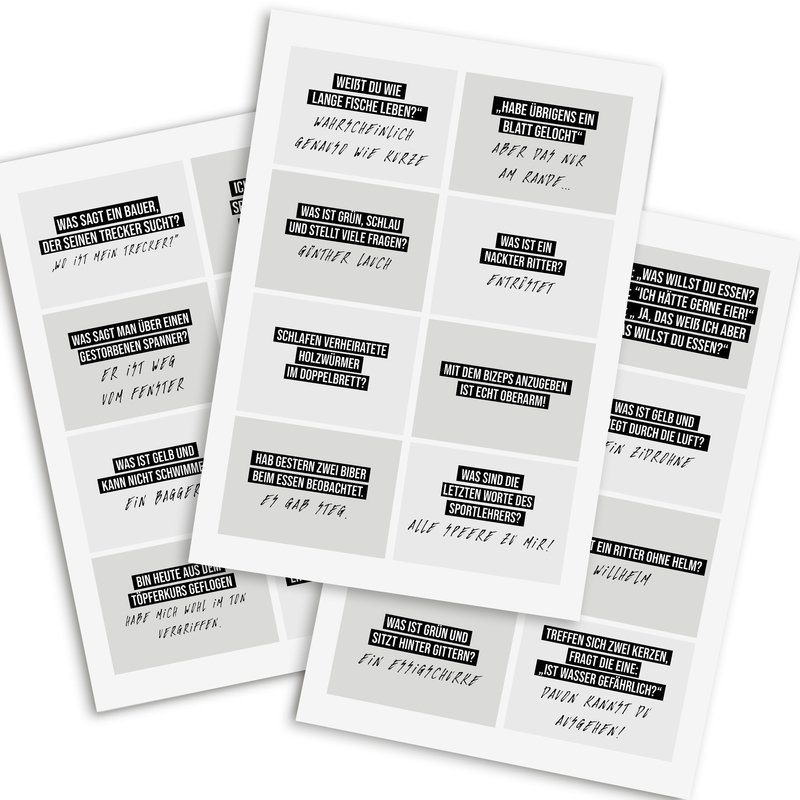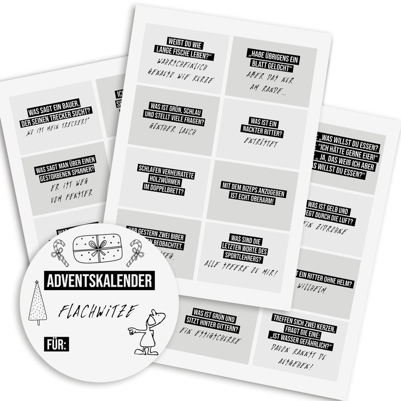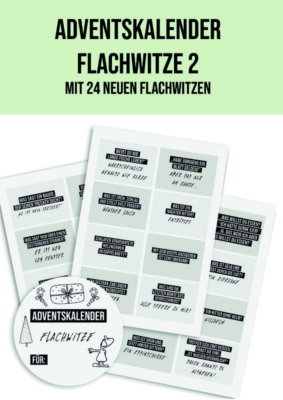 Du erhältst 3 DIN A4 Seiten mit insgesamt 24 Flachwitzen. Diese schneidest Du nach dem Ausdrucken aus und kannst die 24 Zettel nach Herzenslust verpacken.