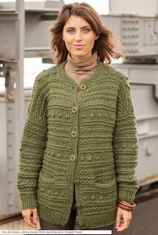 Fast schon wie eine Trachtenjacke kommt diese dunkelgrüne Jacke daher, dadurch würde sie ausgezeichnet zu einem Dirndl oder einer Lederhose passen. Aus einem dicken Garn aus Schurwolle, Baumwolle und Yak mit 8-er-Nadeln gestrickt kommt man schnell voran beim Stricken. Seitenschrägungen und nach oben hin weite Ärmel ergeben eine bequeme Weite im Brustbereich. Und die Taschenbeutel bieten bei Bedarf Platz für ein Taschentuch und einen Schlüssel. Die Knopfleiste und die Ausschnittblende sind kraus rechts gestrickt, alle Bündchen im Rippenmuster. Eine Anleitung dazu gibt es für die Größen 38/40, 44/46 und 50/52.