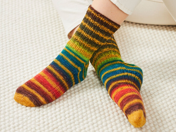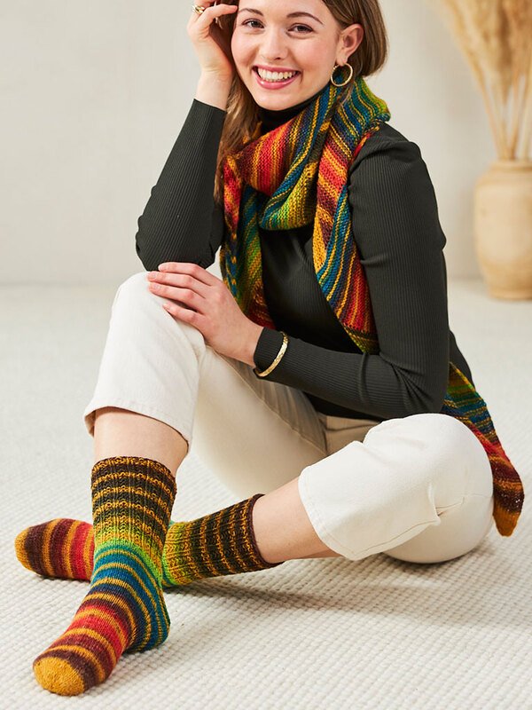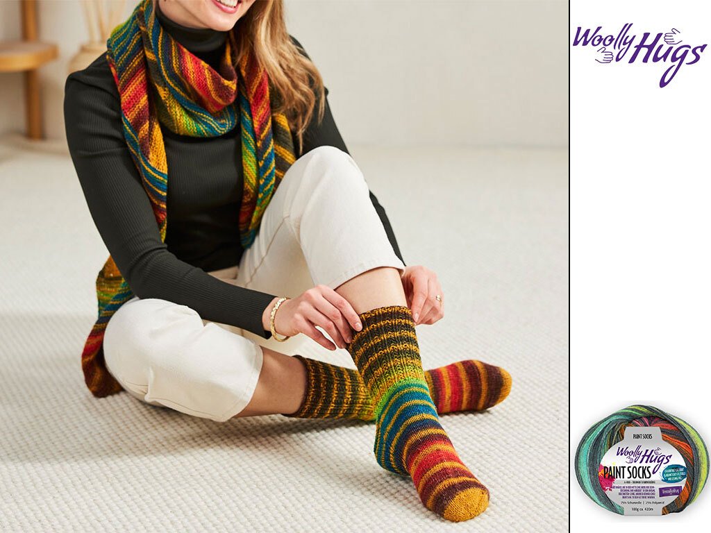 Unsere Anleitung zeigt dir, wie du mit Woolly Hugs Paint-Socks einen Schal und Socken strickst, die durch ihre einzigartigen Muster begeistern. Steifen und Dreiecke verleihen deinem Set eine besondere Struktur.