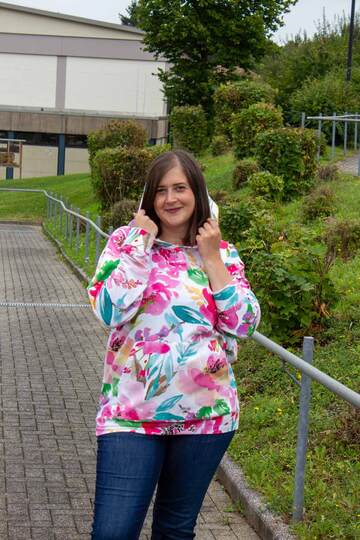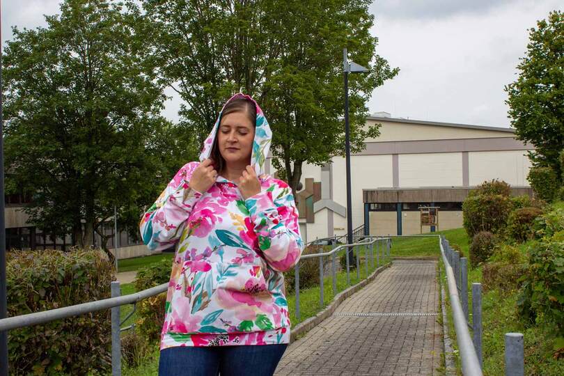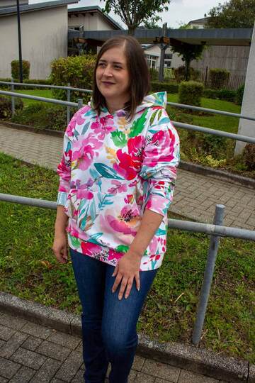 Dieser Schnitt für einen Oversize Hoodie mit Kapuze oder Pullover/Sweater mit Rundhalsausschnitt und Känguru-Bauchtasche, nähbar aus Sweat, Strick, French Terry und optional Bündchenware, trägt den schönen Namen "Ein buntes Leben".