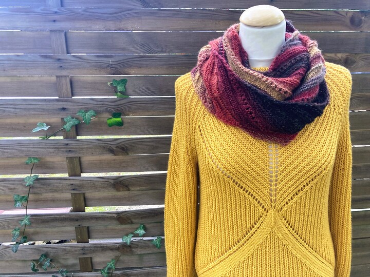 Es können viele Garnstärken verwendet werden. Eine Maschenprobe ist entbehrlich. Dazu bis zu 1 Nadelstärke größer als auf der Banderole angegeben. Dann wird es sehr schön fluffig und fällt leicht. Ich empfehle ein sehr weiches Garn, z. B. ein Merinogarn, damit es am Hals nicht kratzt.