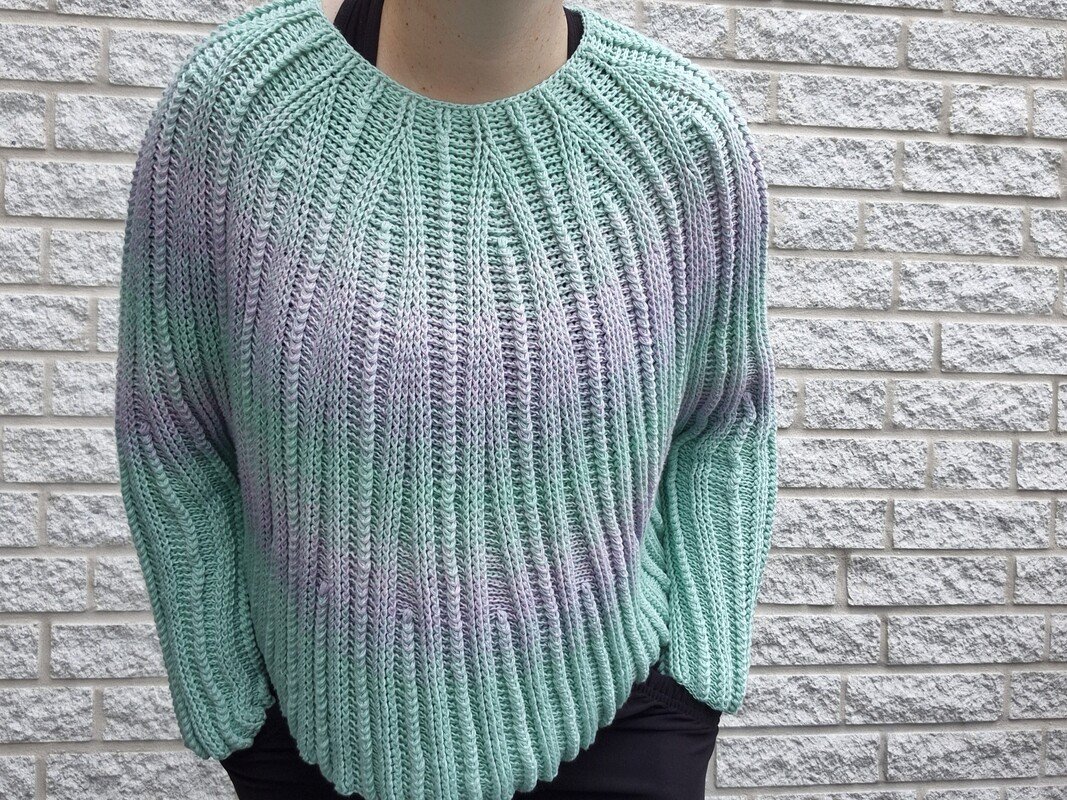 Größe / Material für Rumpf (50 g = 190 mLL) / Material für Ärmel (50 g = 190 mLL), entspricht einem 4-fädigen Farbverlaufsbobbel