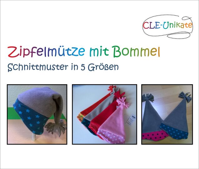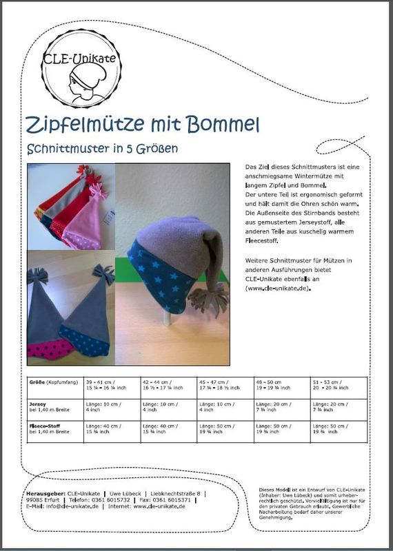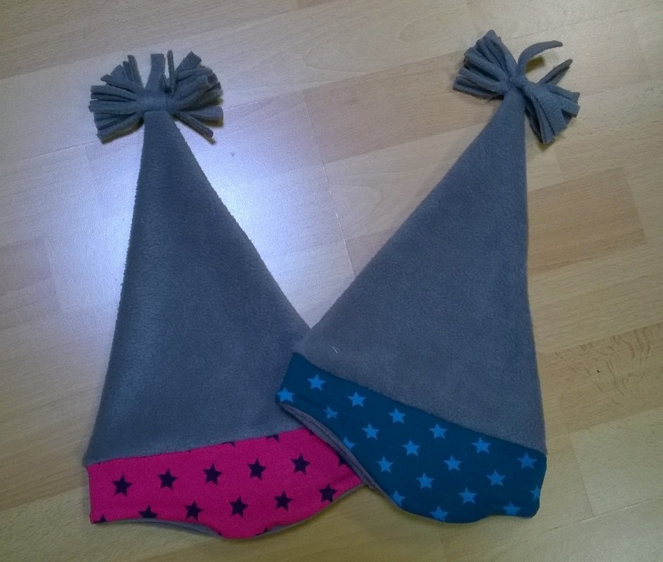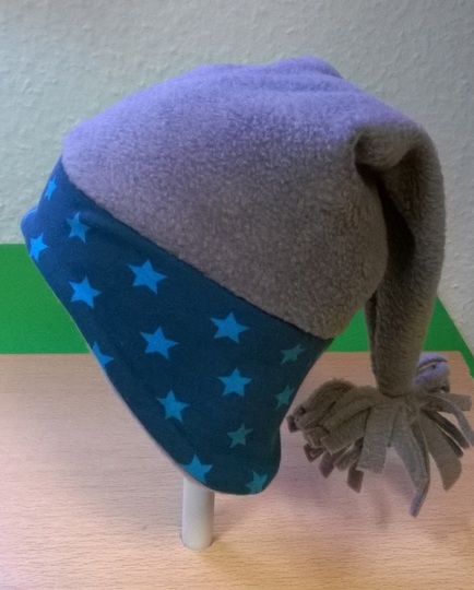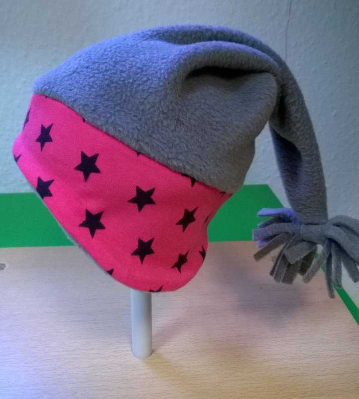 Das Ziel dieses Schnittmusters ist eine anschmiegsame Wintermütze mit langem Zipfel und Bommel. Der untere Teil ist ergonomisch geformt und hält damit die Ohren schön warm. Die Außenseite des Stirnbandes besteht aus gemustertem Jerseystoff, alle anderen Teile aus kuschlig warmem Fleecestoff.