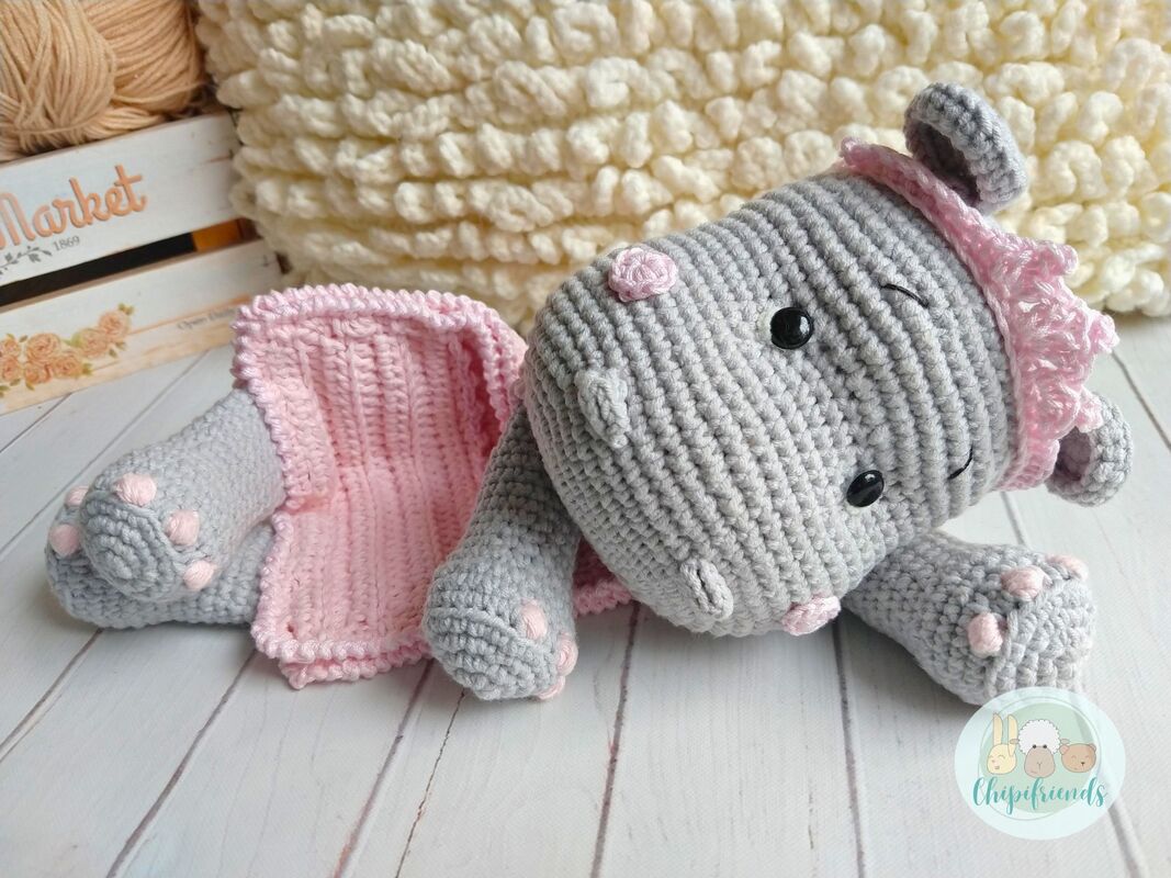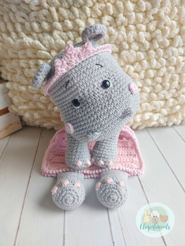Die Nilpferd-Decke ist 30 cm lang, aus mittlerem Baumwollgarn und Nadel Nr. 3 gehäkelt wird.