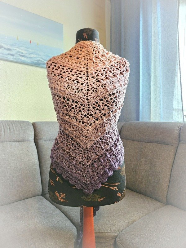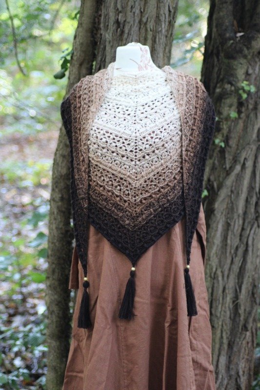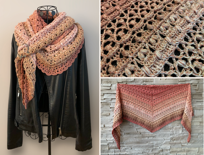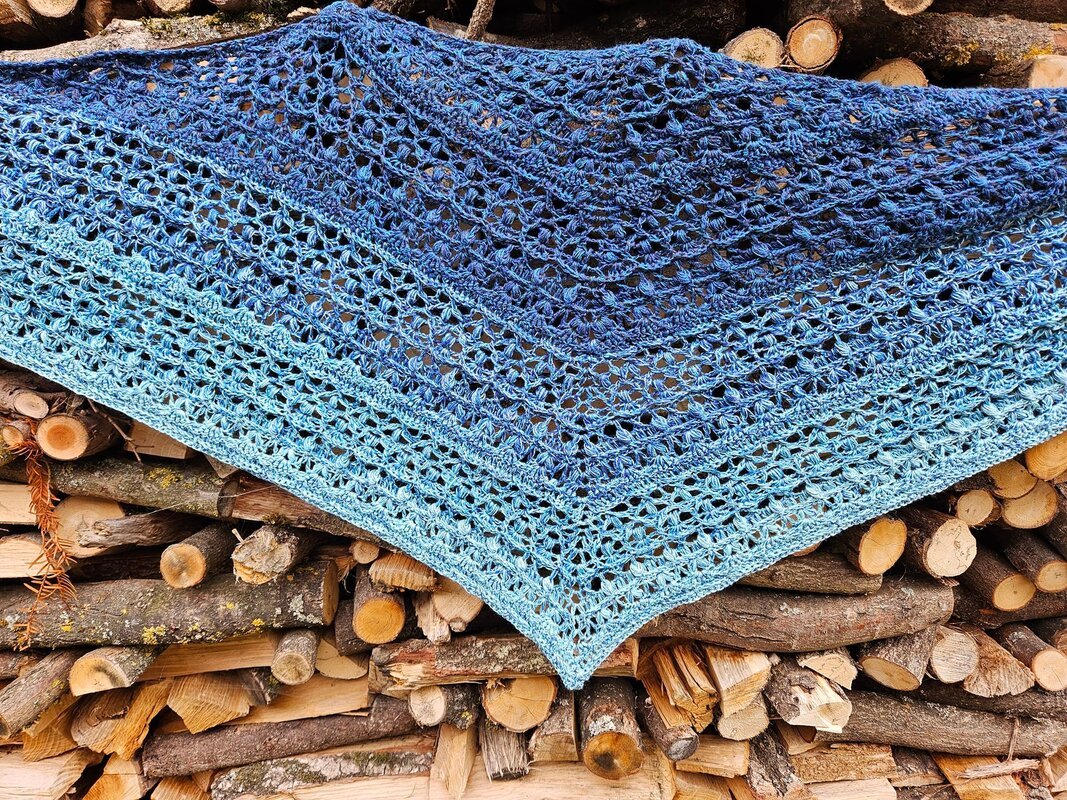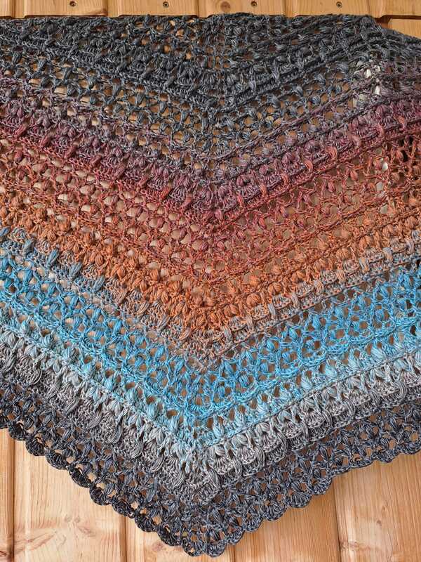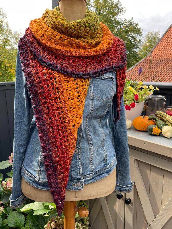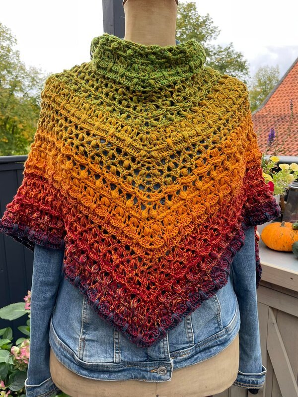 Despina ist ein traumhaft schönes, verspieltes, flaches Dreieckstuch, Durch die Reliefstäbchen und Büschelmaschen entsteht ein 3D Effekt, das Tuch ist ein toller Blickfang für den Herbst!