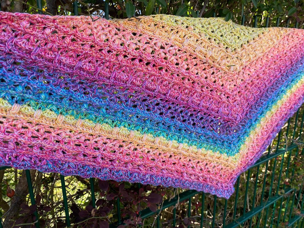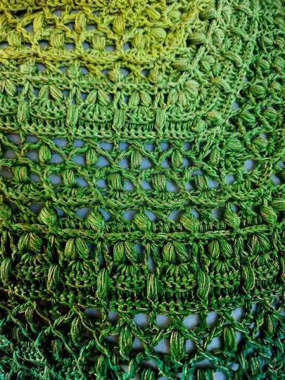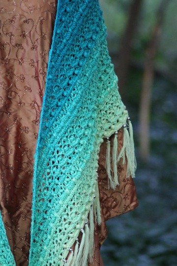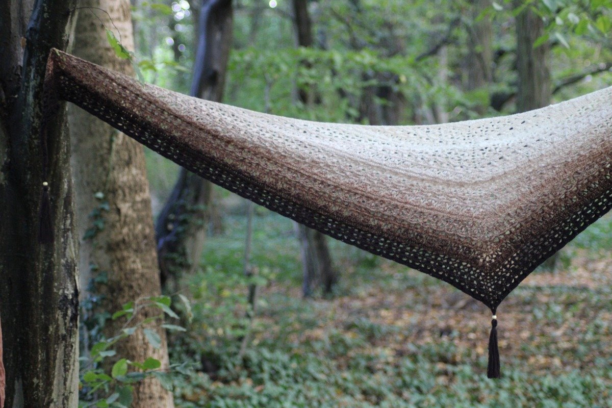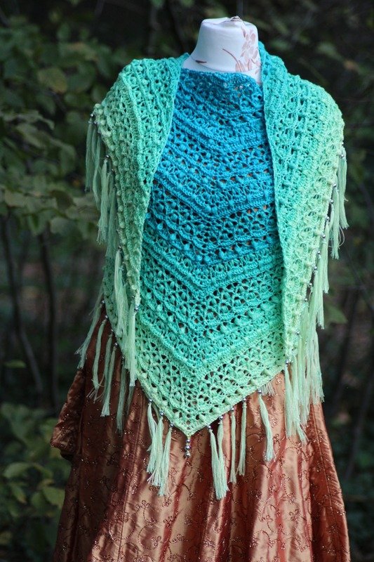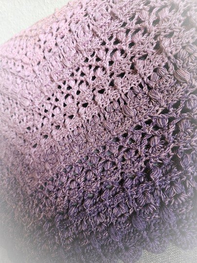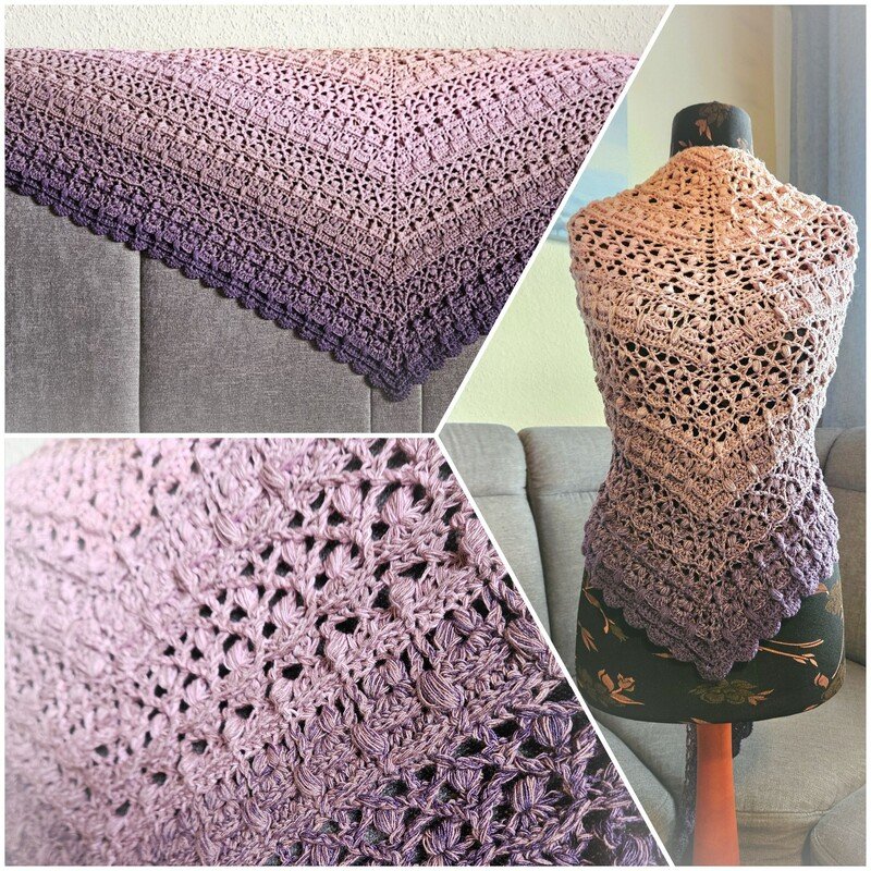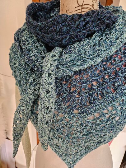 Despina ist ein traumhaft schönes, verspieltes, flaches Dreieckstuch, Durch die Reliefstäbchen und Büschelmaschen entsteht ein 3D Effekt, das Tuch ist ein toller Blickfang für den Herbst!
