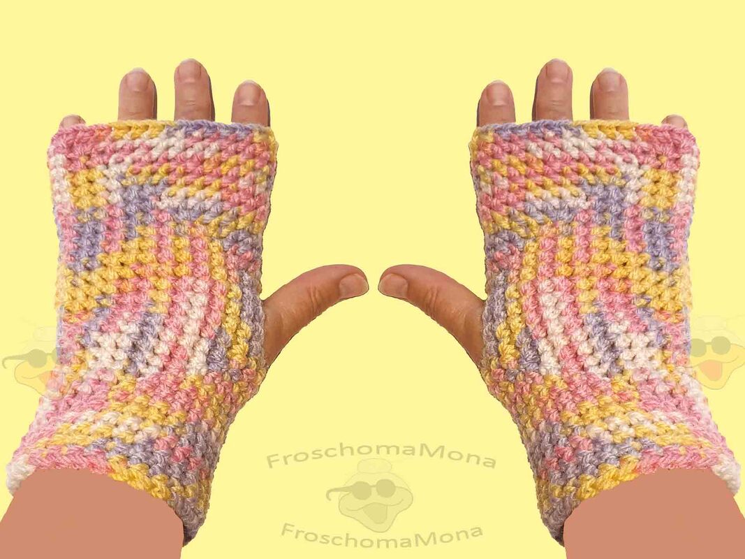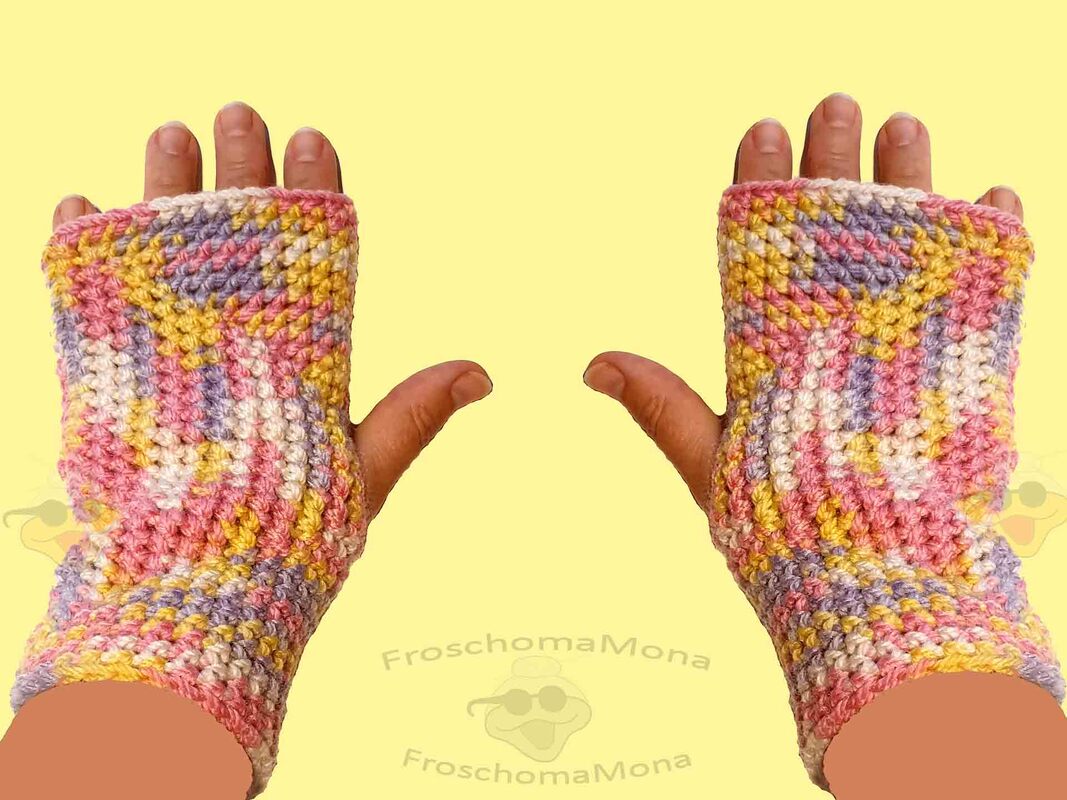 Somit kannst du mit der Anleitung Handstulpen vom Kleinkind mit winzigen Händen bis zu „Riesenpfoten“ häkeln.