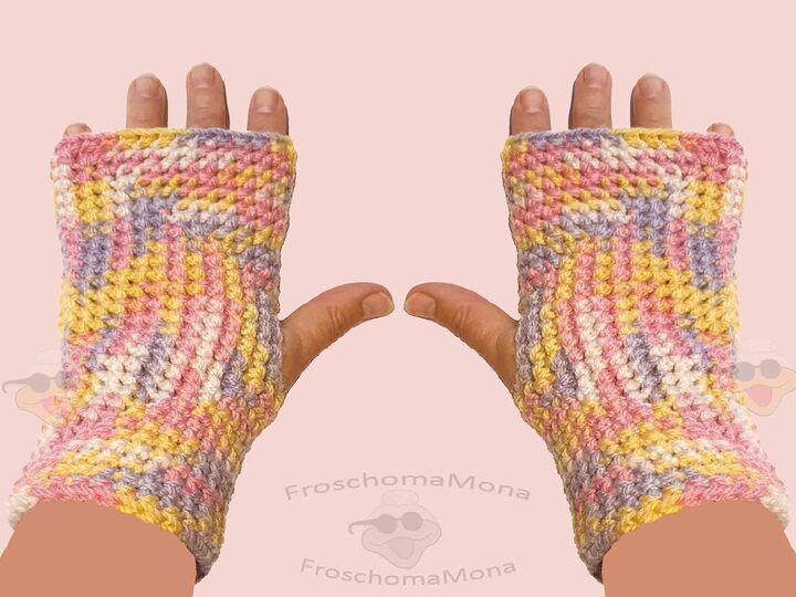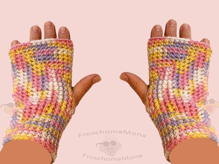 Die Handstulpen sehen auch mit einfarbigem Garn, z. B. rot, schwarz, blau, grün, braun, orange, pink usw. gut aus. Du kannst auch Farbverlauf mit anderen Farben verwenden.