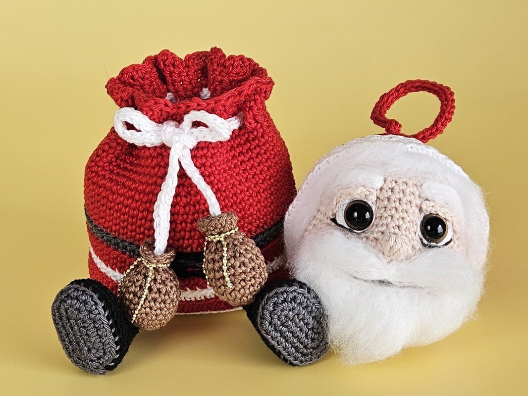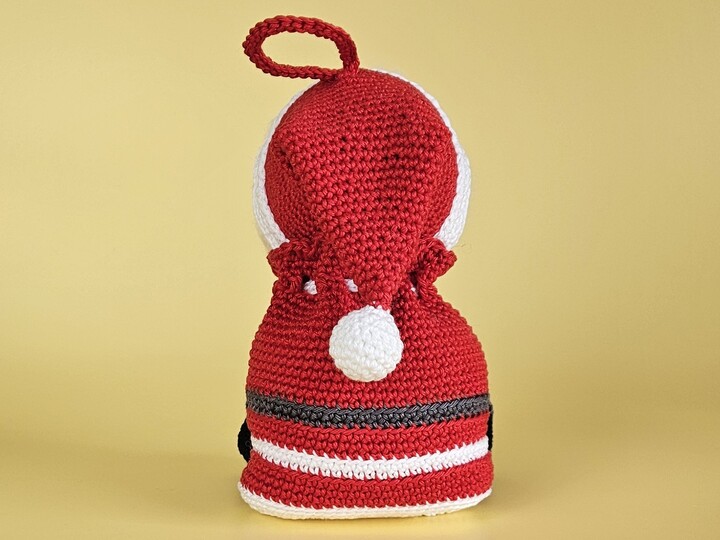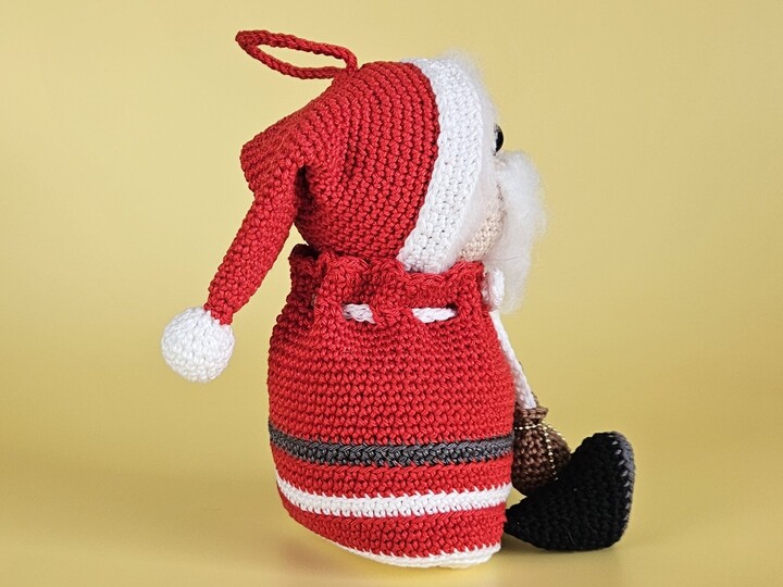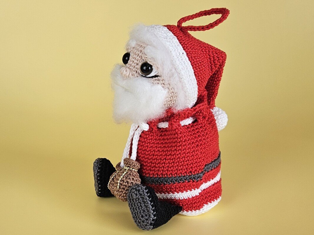 Der Weihnachtsmann lächelt freundlich unter seinem flauschigen Bart, während seine rote Mütze mit weißem Rand und einem weißen Bommel das Design perfekt abrundet. Ein weißes Band mit zwei kleinen Beuteln verleiht dem Säckchen eine liebevolle Note, und seine Stiefel schauen unten verspielt hervor.