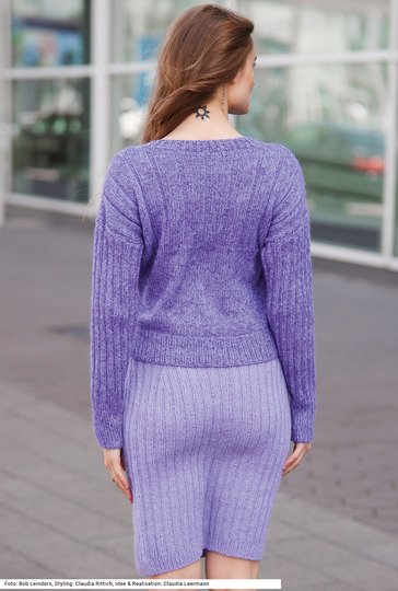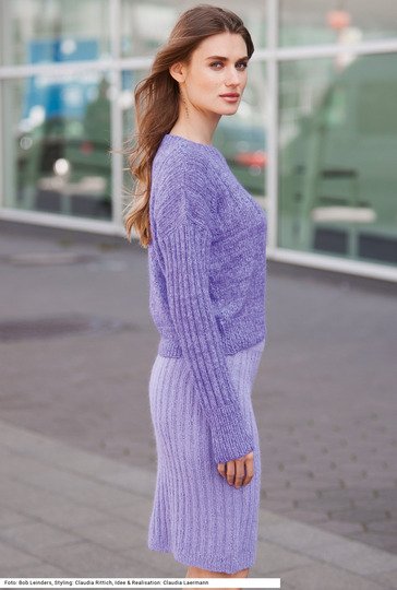 Die gekonnte Schnittführung des Pullovers wird durch betonte Zunahmen in Szene gesetzt, während das etwas schmalere Rippenmuster der Ärmel dem Design noch ein "Mehr" an femininer Aura verleiht. Eine Blende im Rippenmuster rundet den Halsausschnitt ab. Der schmale Rock wird von oben nach unten in Runden gearbeitet, mit regelmäßigen Zunahmen für die Hüftschrägungen und einem doppelten Bund mit Umbruch, welcher das innen eingelegte Taillengummiband verbirgt.