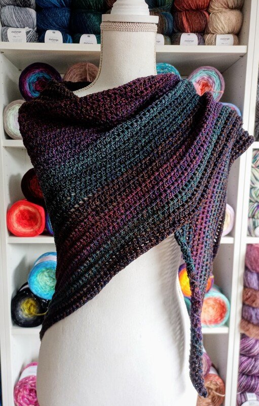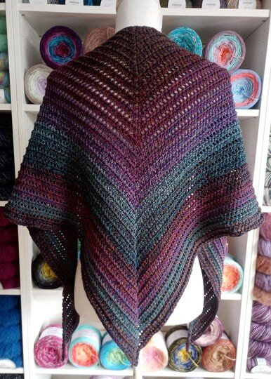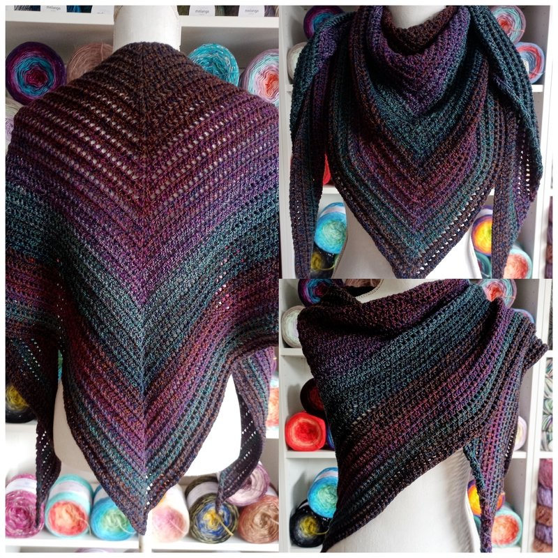 Es braucht nicht immer viele oder gar komplexe Muster um ein schönes Tuch zu häkeln. Dieses Tuch besticht durch seine einfache Eleganz und einem sehr einfachen und fernsehtauglichen Muster. Das Muster eignet sich perfekt für besonders bunte Bobbel und Wolle, da es durch seine Schlichtheit etwas Ruhe in sehr bunte Farbverläufe reinbringt.