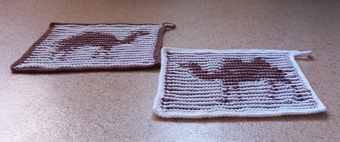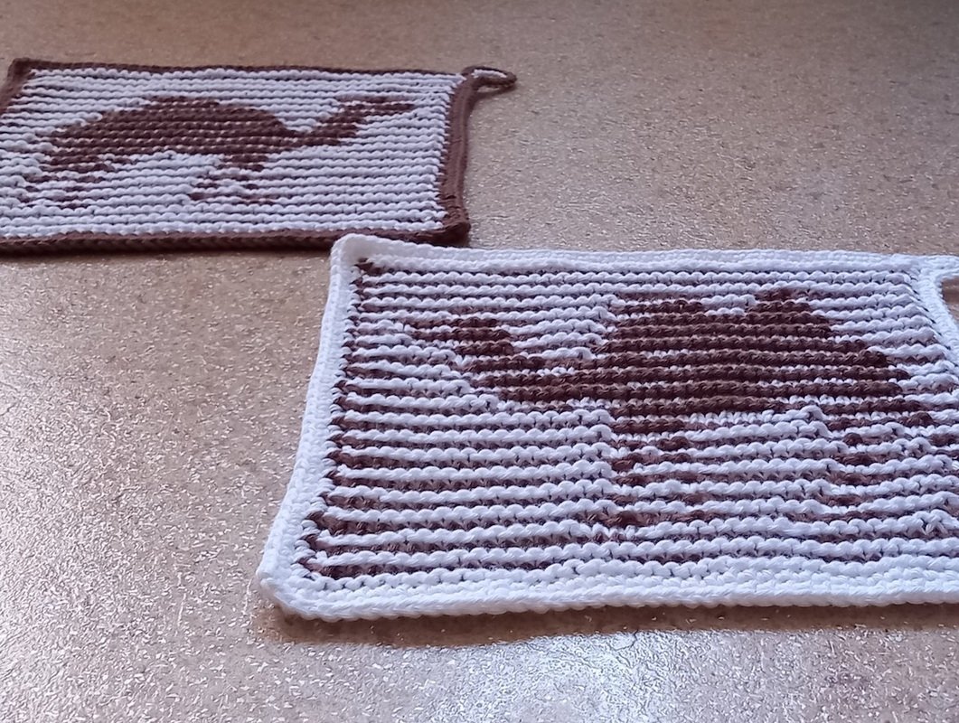 Ihr benötigt jeweils zwei gleichstarke Garne mit starkem Hell-Dunkel-Kontrast (z.B. Braun und Weiß). Für Topflappen empfiehlt sich 8/8 Baumwollgarn (z.B. Cotton 8/8 von Hobbii). Für Spüllappen könnt ihr auch dünneres Garn nehmen - auch hier aber wegen der guten Hitzebeständigkeit Baumwolle oder Leinen, z.B. Baumwollgarn 8/4. Und natürlich könnt ihr für andere Projekte auch anderes Garn verwenden! Je ein 50-g-Knäuel 8/8-Garn pro Farbe reicht für zwei Topflappen ohne Umrandung. Für die Umrandung braucht ihr pro Lappen etwa einen weiteren Viertel 50-g-Knäuel. Vom 8/4-Baumwollgarn genügt je ein Knäuel einer Farbe für vier Lappen (ohne Umrandung). Dazu benötigt ihr Stricknadeln – ich habe für die Topflappen 4er verwendet (im Zweifel lieber die dünnere wählen) - und eine passende Häkelnadel (bei mir 3,5). Für dünnere Lappen: Stricknadel 3, Häkelnadel 2,5.