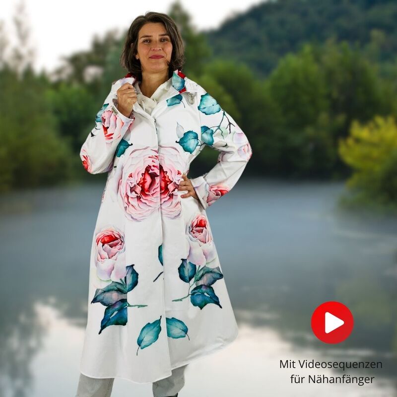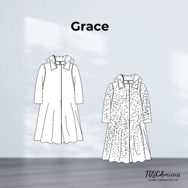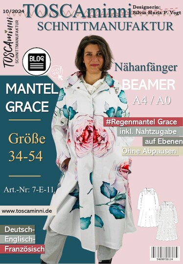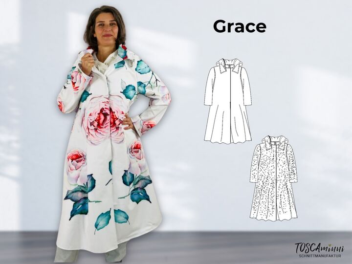Mit dem Schnittmuster Grace nähst Du einen stilvollen Softshell-Mantel, der dich vor Regen schützt und gleichzeitig modisch überzeugt. Der Mantel besticht durch seinen weiten A-Linien-Schnitt mit wunderbarem Fall.