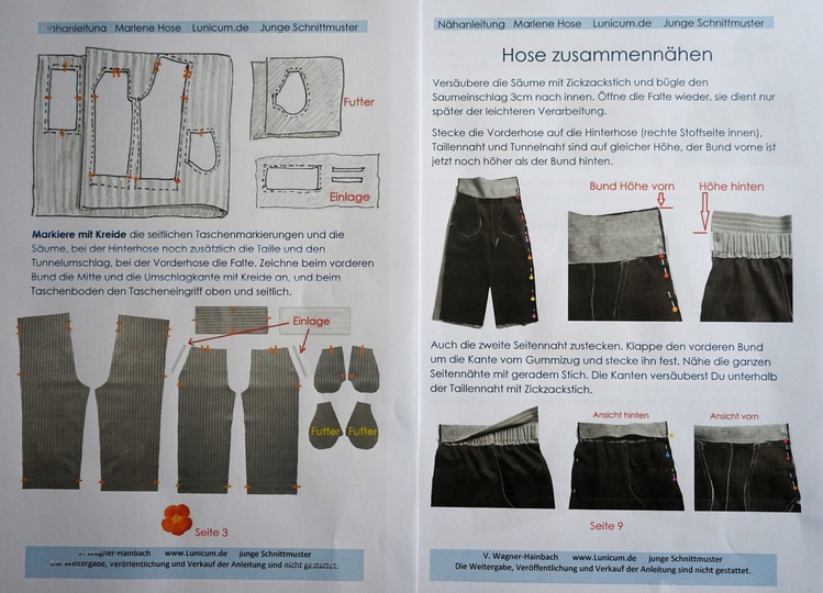 Zu dem Schnitt bekommt Ihr eine ausführliche Arbeitsanleitung mit vielen Fotos, mit der Ihr die Hose Schritt für Schritt nacharbeiten könnt, Ihr braucht keine besonderen Vorkenntnisse.