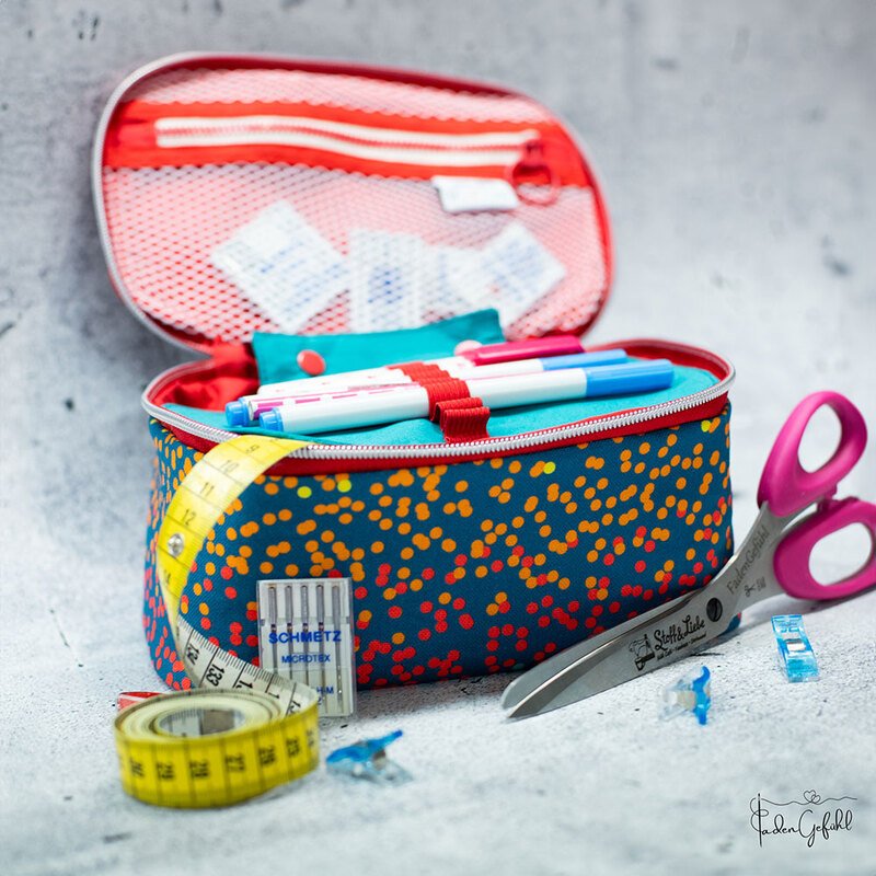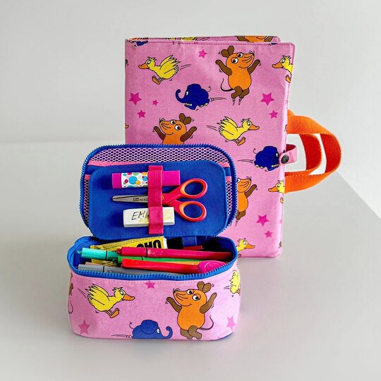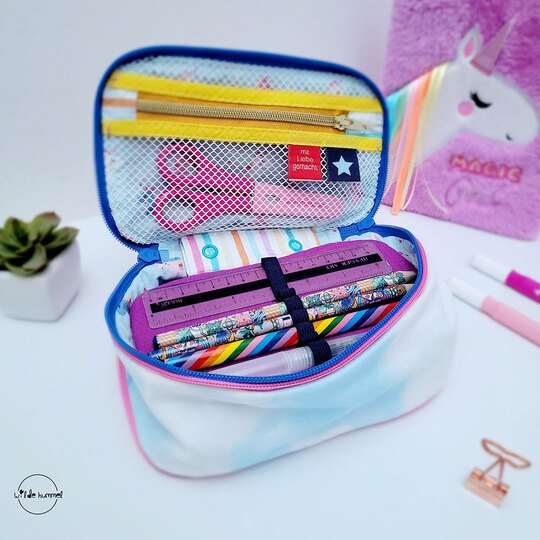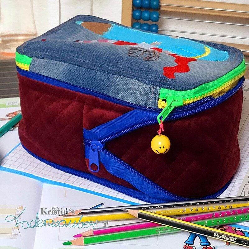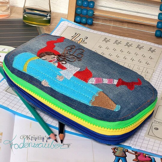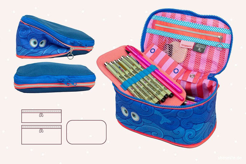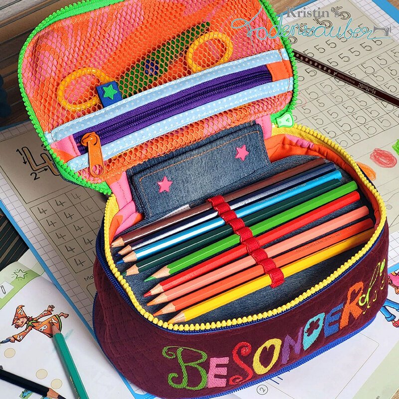 Die Geschichte hinter der Schnittmuster-Idee: Der Lehrer meiner Tochter hat darum gebeten, dass die Kinder nicht mehr 2 Mäppchen (Federmäppchen und Schlampermäppchen) in der Schultasche dabei haben sollen, sondern nur noch eines: Ein Schlampermäppchen in das ALLES passt. Um das gewünschte Schreibzeug inklusive Geodreieck schön verpackt unter bringen zu können, brauchte es also ein Schlampermäppchen bei dem mindestens eine gerade Fläche so groß ist, dass das Geodreieck nicht knickt oder bricht. Klar, so ein Schlampermäppchen könnte man auch kaufen, doch selbstgenäht aus dem Lieblingsstoff der Tochter ist es nochmal etwas ganz anderes.
