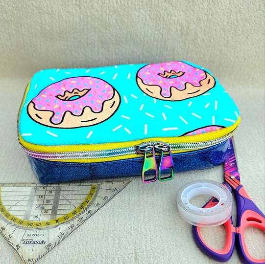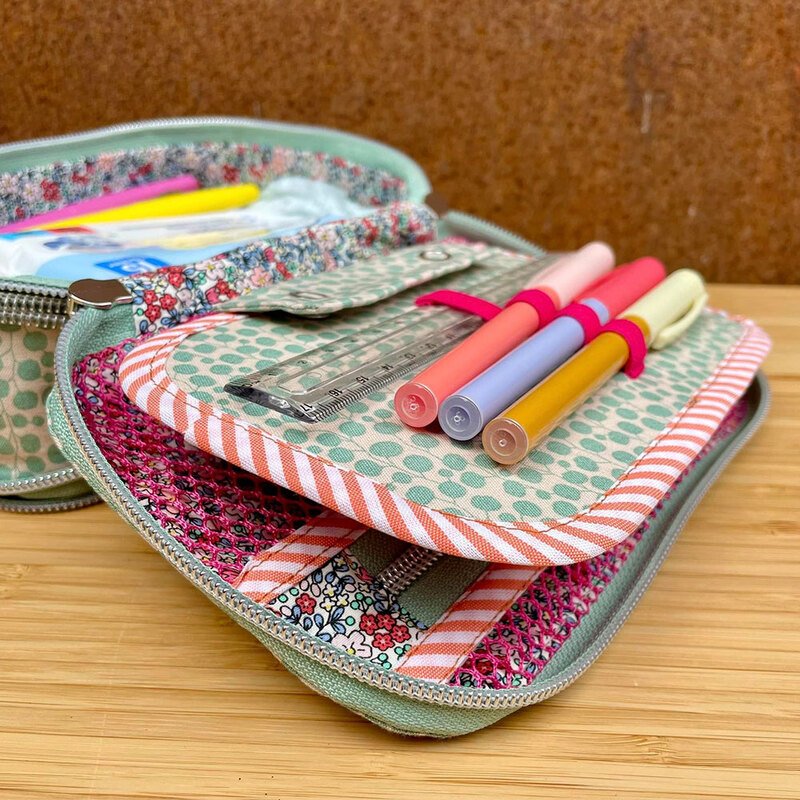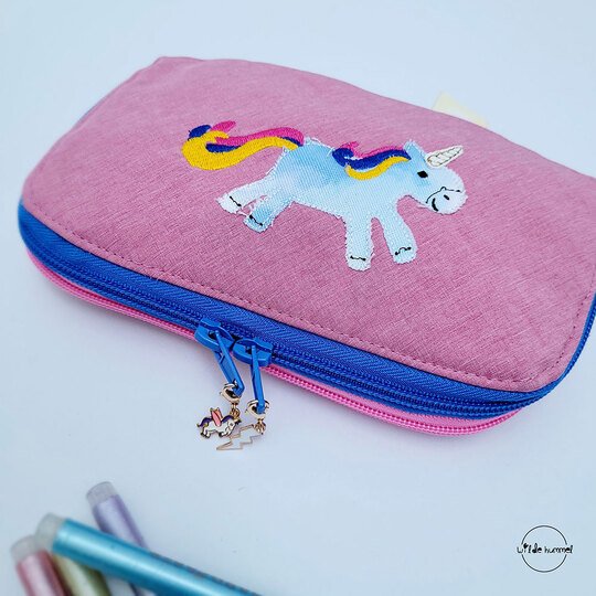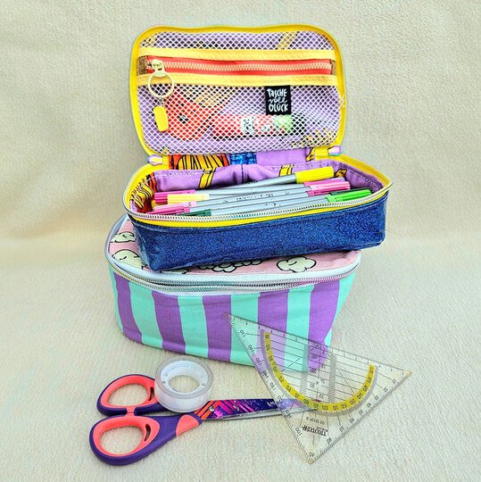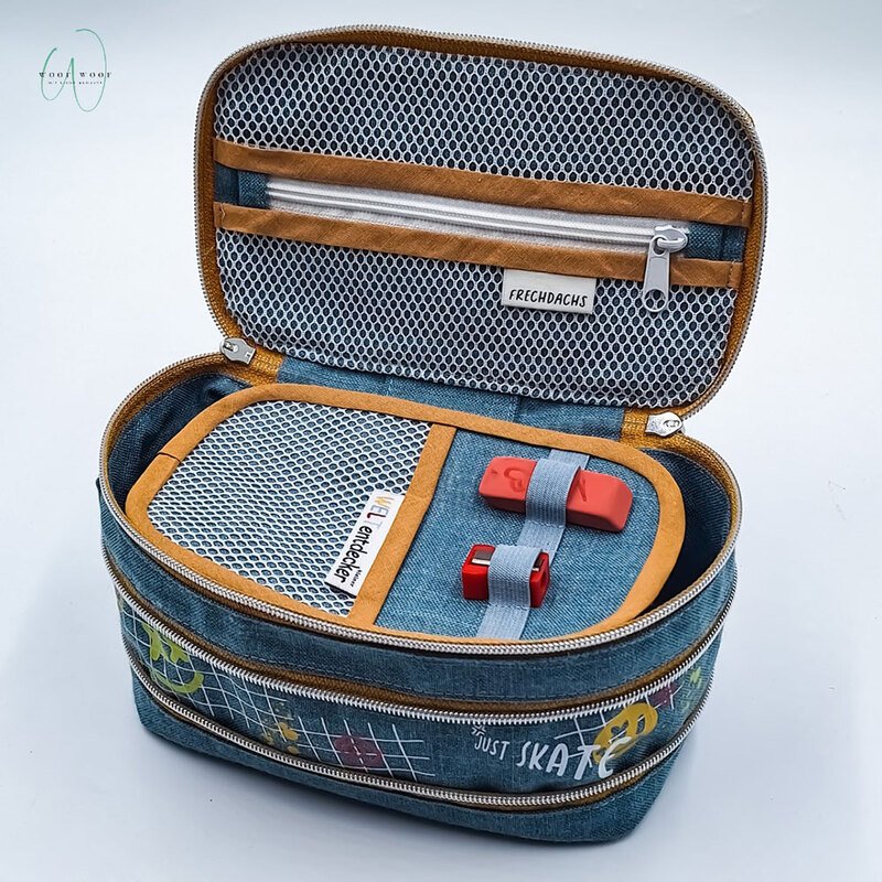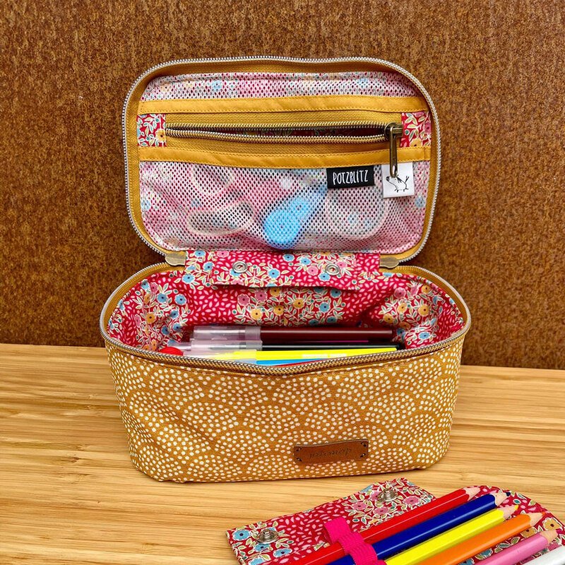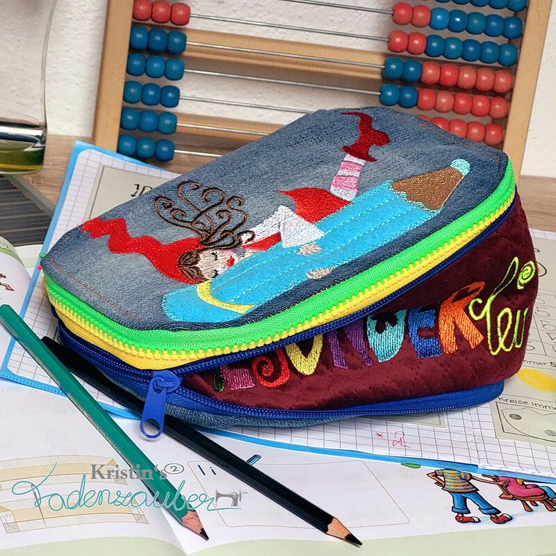 Die Geschichte hinter der Schnittmuster-Idee: Der Lehrer meiner Tochter hat darum gebeten, dass die Kinder nicht mehr 2 Mäppchen (Federmäppchen und Schlampermäppchen) in der Schultasche dabei haben sollen, sondern nur noch eines: Ein Schlampermäppchen in das ALLES passt. Um das gewünschte Schreibzeug inklusive Geodreieck schön verpackt unter bringen zu können, brauchte es also ein Schlampermäppchen bei dem mindestens eine gerade Fläche so groß ist, dass das Geodreieck nicht knickt oder bricht. Klar, so ein Schlampermäppchen könnte man auch kaufen, doch selbstgenäht aus dem Lieblingsstoff der Tochter ist es nochmal etwas ganz anderes.
