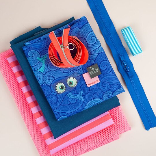 Außenstoff, Innenstoff, (Endlos-) Reißverschluss mit 2 Zippern und Nähgarn in passender Farbe. Außerdem: Bügelvlies zum Stärken und Polstern der Schnittteile (z.B. H250, H640, Decovil oder Schabracken Einlage S133).