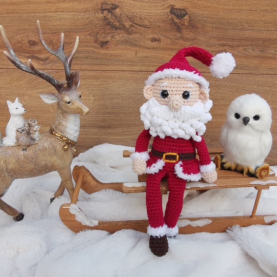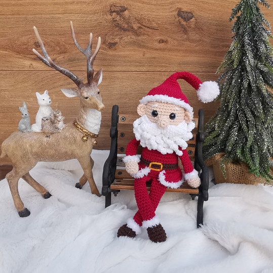 Dieser süße kleine Kerl hier darf natürlich in keiner Weihnachtsdeko fehlen. Körper und Kopf sind ein Teil. Die Arme und Beine werden direkt mit eingehäkelt. Annähen müsst ihr am Schluss nur noch die Nase, die Ohren und den Bart. Der Weihnachtsmann hat Schlenkerbeine und kann somit nur sitzen und nicht stehen.