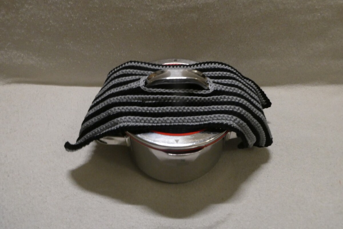 EIN Topflappen, der Deckel und Griffe bedeckt. Ein Verrutschen ist kaum noch möglich und man muss nie den 2. kleinen Lappen suchen. ;-)