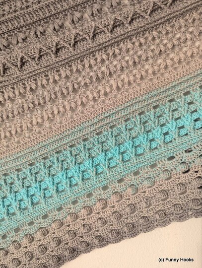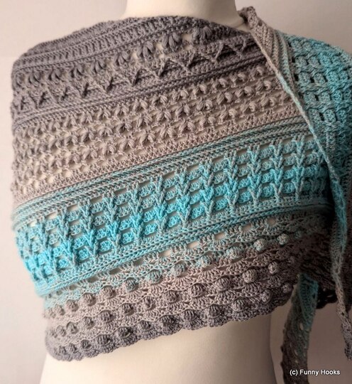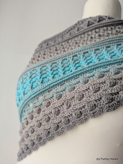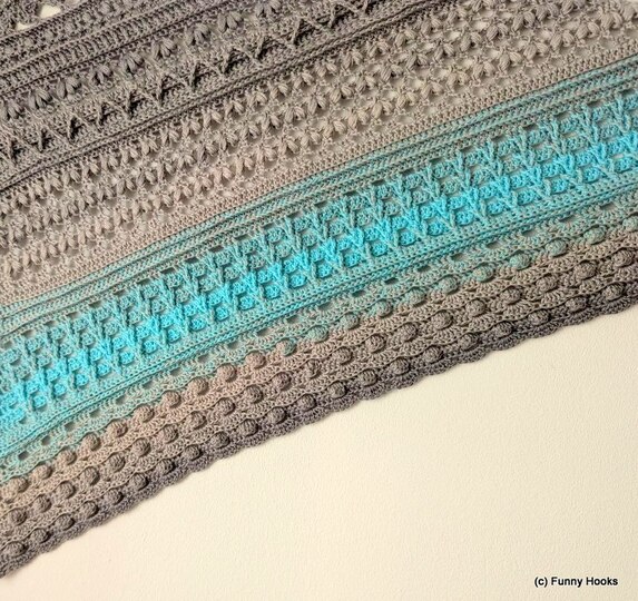 Das Tuch vom Titelbild wurde mit 1000 m, 3-fädig des Bobbel "Bergnymphe" von Funny Hooks gearbeitet. Mit einer Häkelnadel 2,75 mm ergab das Tuch eine Größe von 180 x 55 cm.