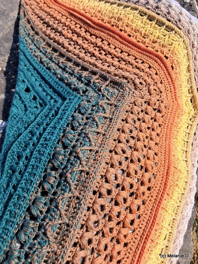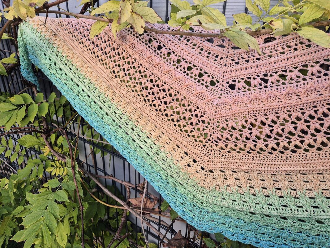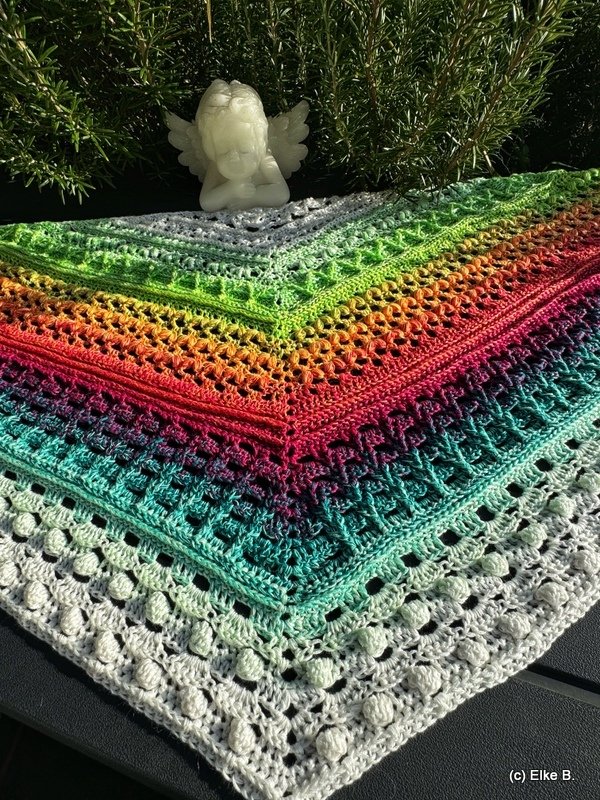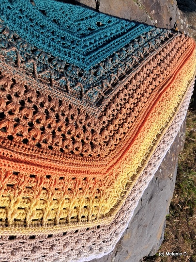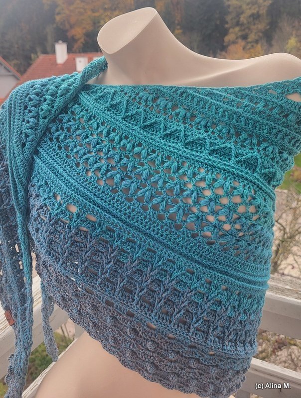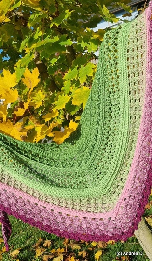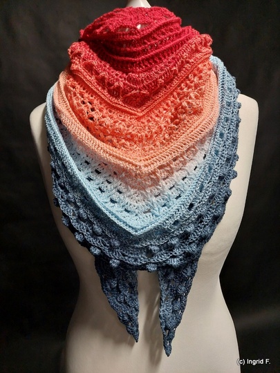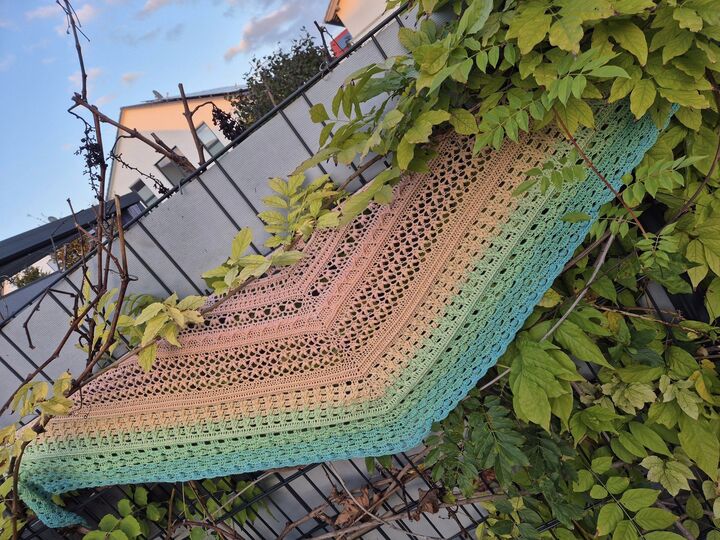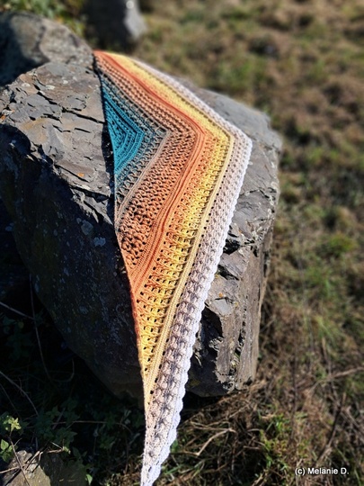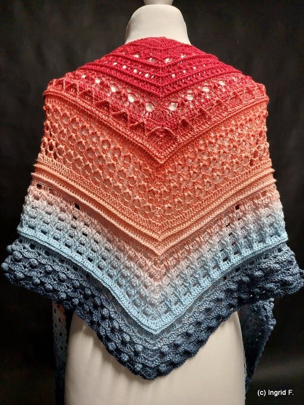 Das Tuch eignet sich perfekt für Farbverlaufsgarn, kann aber auch in uni oder jedem beliebigen Garn gearbeitet werden.