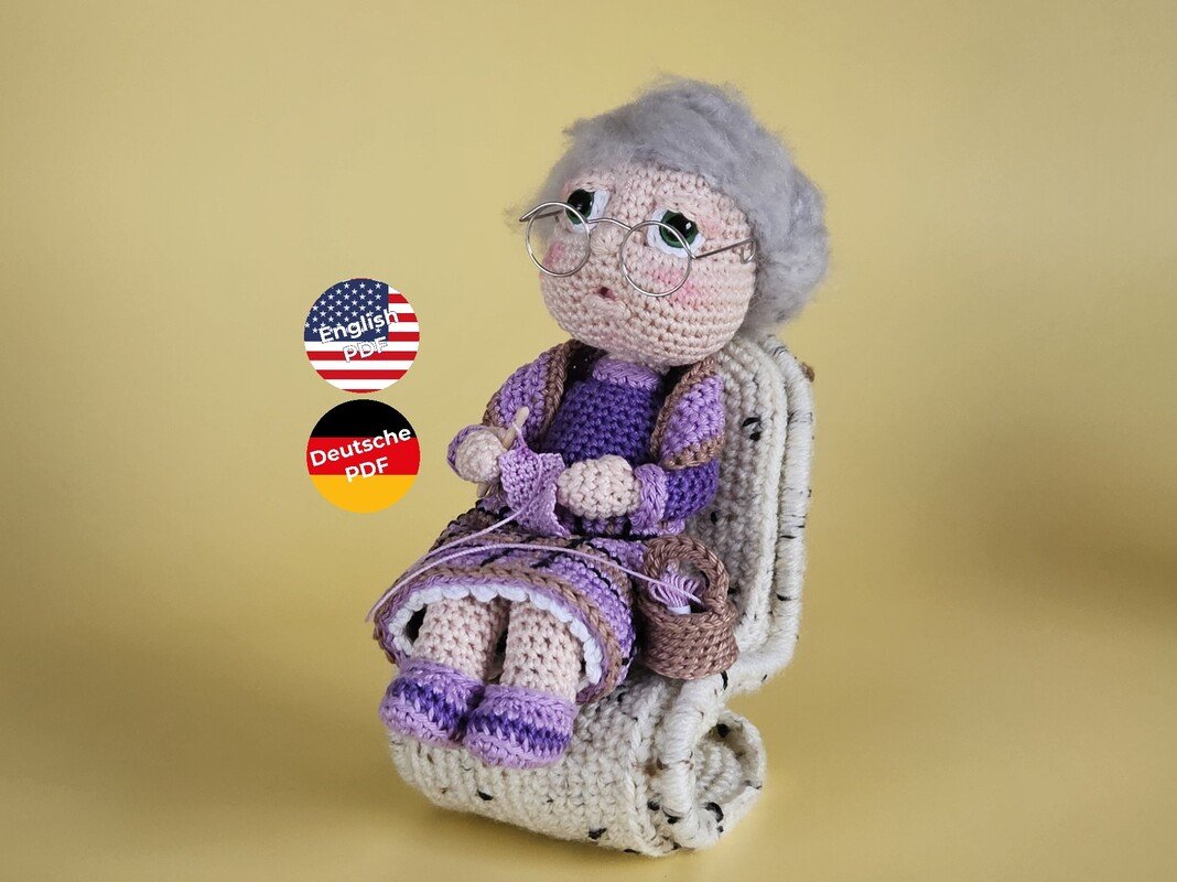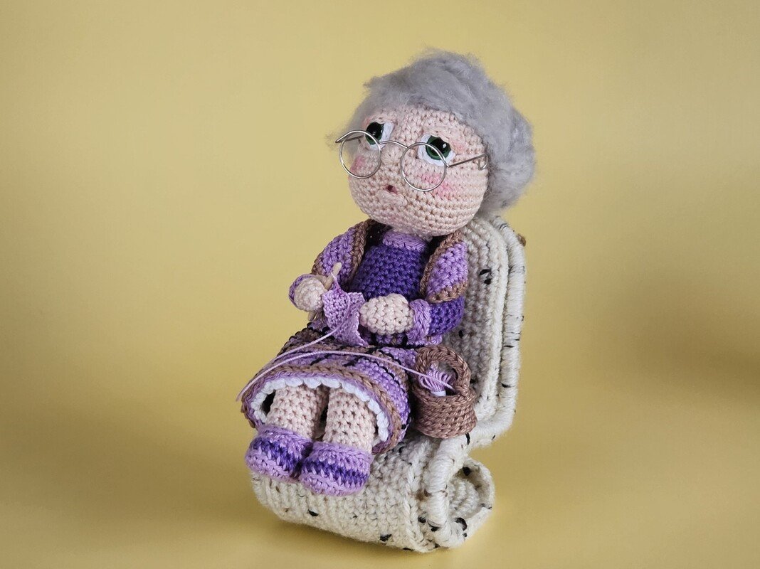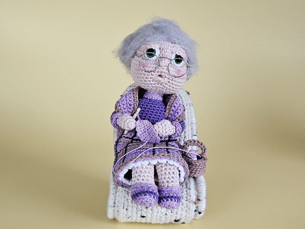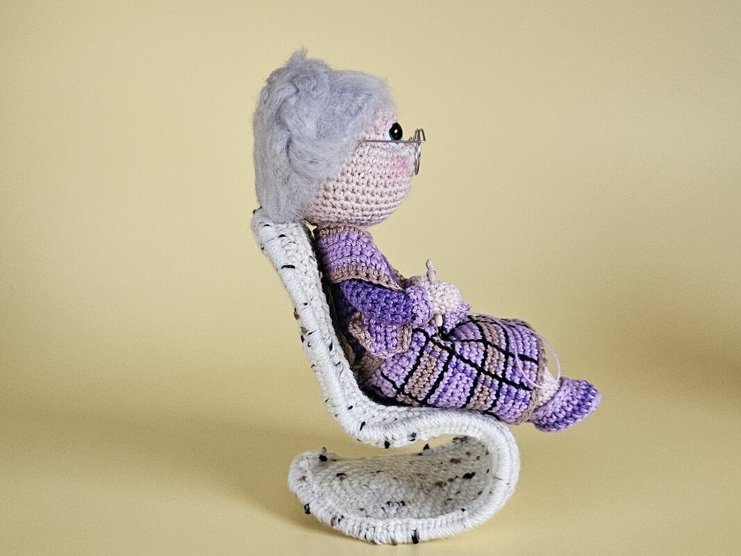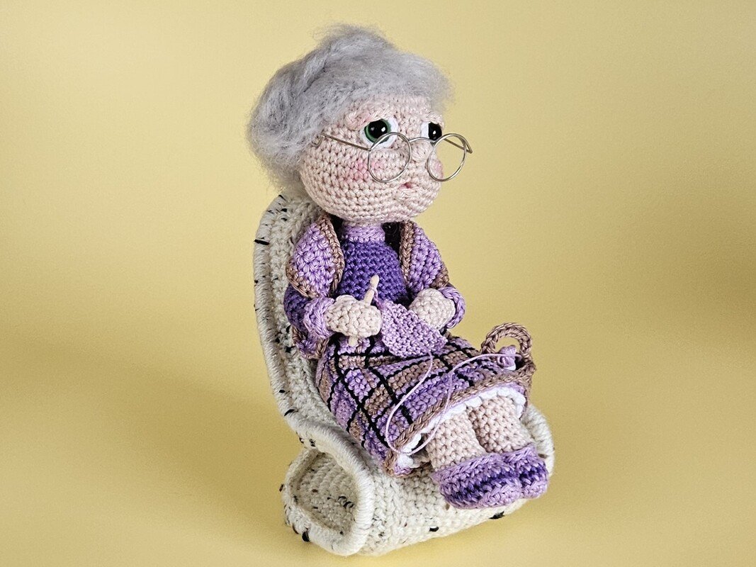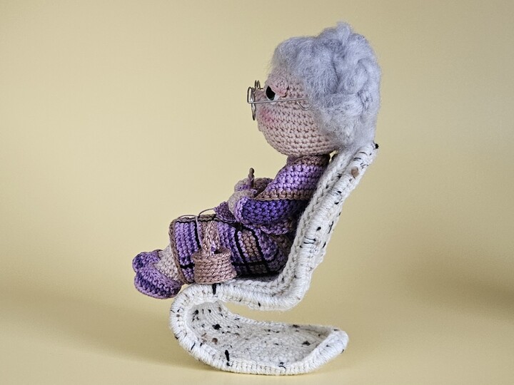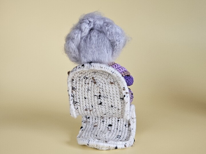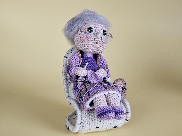 Oma Gerda sitzt gemütlich in ihrem Schaukelstuhl und widmet sich ihrem liebsten Hobby, dem Häkeln. Mit ihrem lila Rock im Streifenmuster und einem passenden Schultertuch sieht sie richtig elegant aus. Ihre grauen Haare hat sie zu einem hübschen Zopfkranz gebunden, und eine schicke Brille sitzt auf ihrer Nase. Neben ihr steht ein kleines Körbchen mit einem Wollbobbel, während sie liebevoll einen lila Schal häkelt.