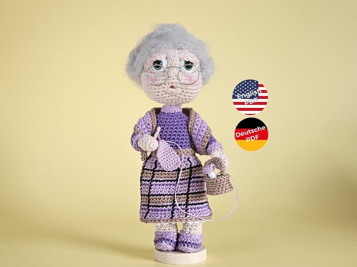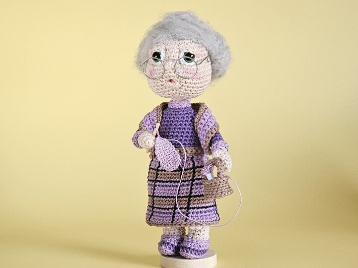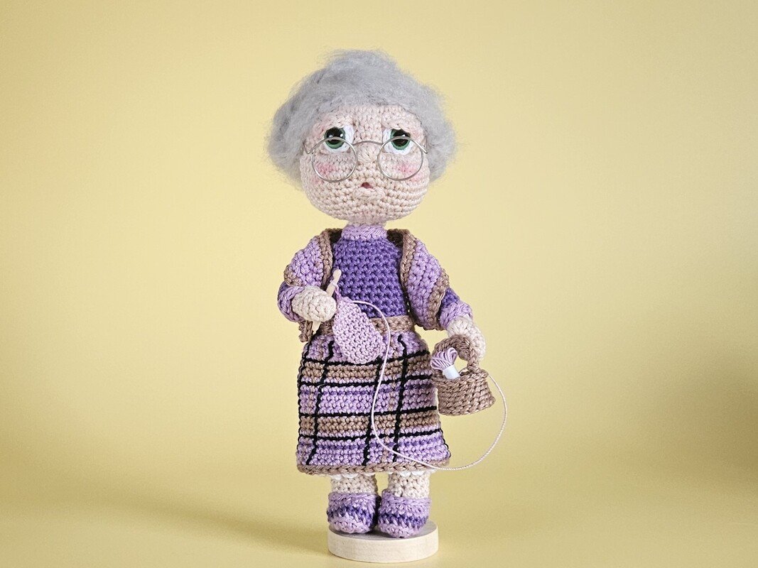 Oma Gerda strahlt Ruhe und Behaglichkeit aus – die perfekte Häkel-Oma, die Freude am Handarbeiten verkörpert.