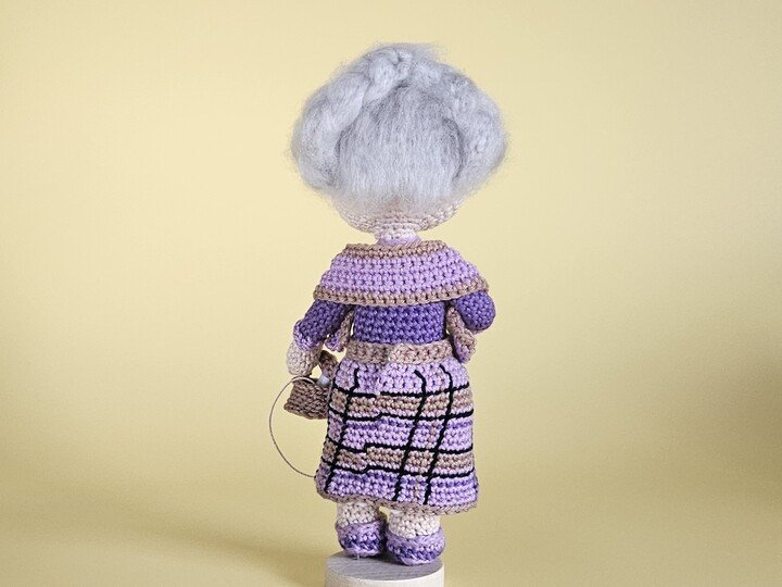 Gerda trägt einen eleganten lila Rock mit feinem Streifenmuster und Spitzenrand, der perfekt mit ihrem Schultertuch harmoniert. Ihre grauen Haare sind ordentlich zu einem Zopfkranz geflochten, und eine kleine Brille ziert ihre Nase.