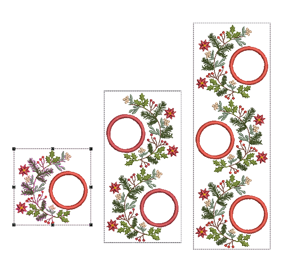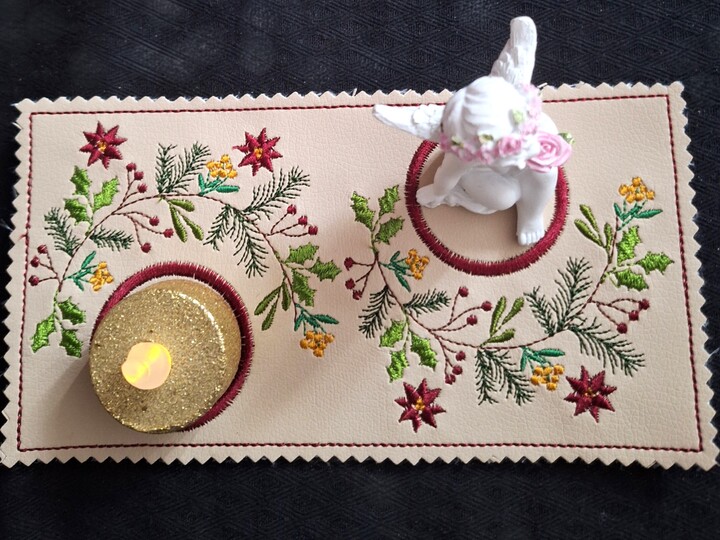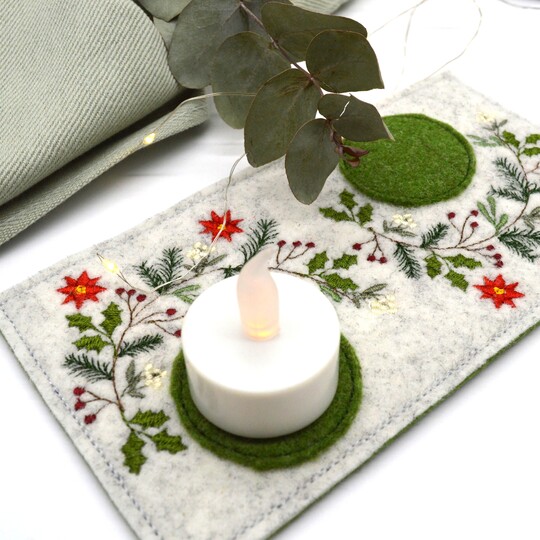 Der Untersetzer wird mit weihnachtlichen Zweigen und kreisrunden Applikationen bestickt (hier kann ein Stoff nach Wahl platziert werden, auch kann die Satinsticheinfassung weggelasen werden) und eignet sich als hübsche Dekoration für die Adventszeit. Auf den kleinen, runden Appliaktionen kann ein Gläschen mit Teelicht oder ein LED Teelicht gesetzt werden.