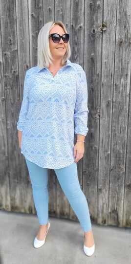 Du erhältst das Blusenshirt in den Größen 34-54 und kannst zwischen verschiedenen Ausführungen wählen. Der elegante Kragen und der V-Ausschnitt mit Blende verleihen der Bluse eine raffinierte Note.