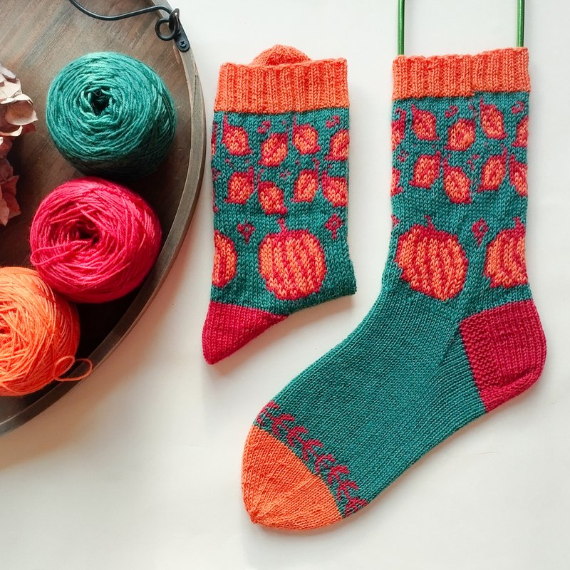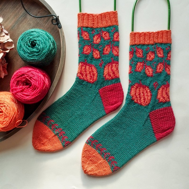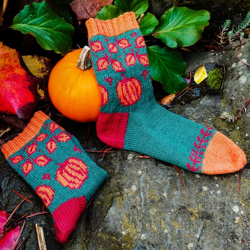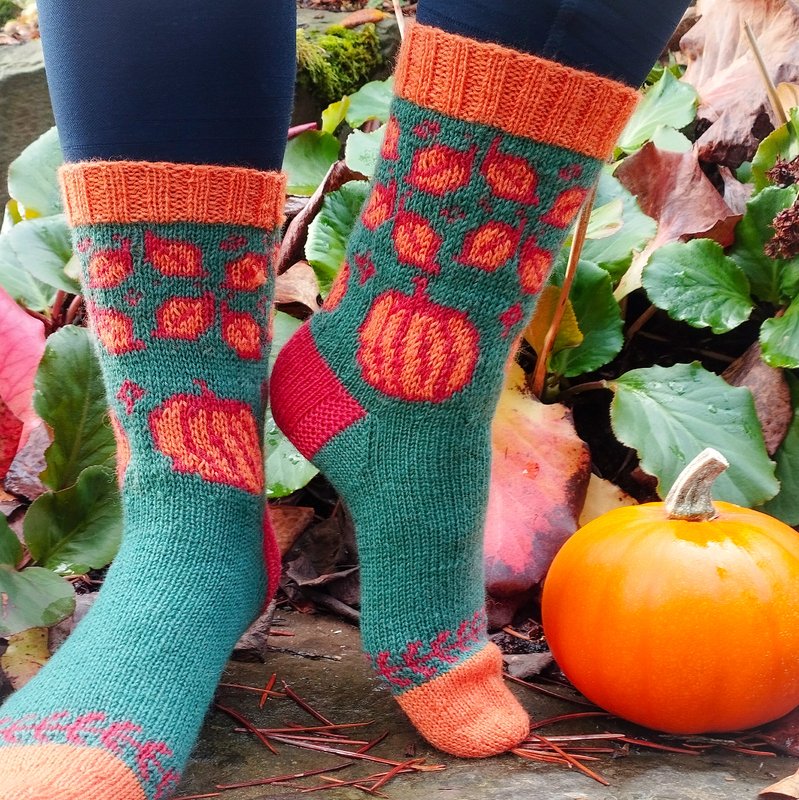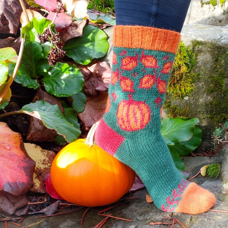 Herbst ist Kürbiszeit und Stricken. Es sich gemütlich zu machen und die ruihgere Zeit genießen. Vielleicht hast Du Lust auf eine Herausforderung? Bei diesen Socken wird das Colourwork mit drei Fäden und der Ladderback-Methode gearbeitet. Aber das Ergebnis belohnt Dich mit diesen wunderschönen Kürbissen.