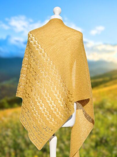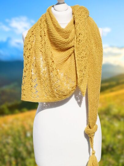 HARVESTGOLD – erweckt ein Bild von atemberaubenden Bergen, die im goldenen Licht der auf- oder untergehenden Sonne leuchten. Die Stimmung dieser Szene wird in der Wahl des Strickmusters eingefangen, das zwischen abwechslungsreichen Lacemuster und beruhigenden Rippen wechselt.