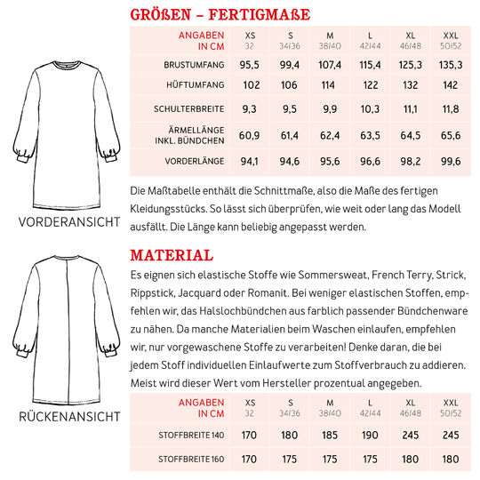 Umfang: 4 PDF-Dateien: Anleitung - 15 Seiten, Schnittmuster DIN A4 - 24 Seiten, Schnittmuster DIN A0 (Originalgröße), Schnittmuster für Beamer