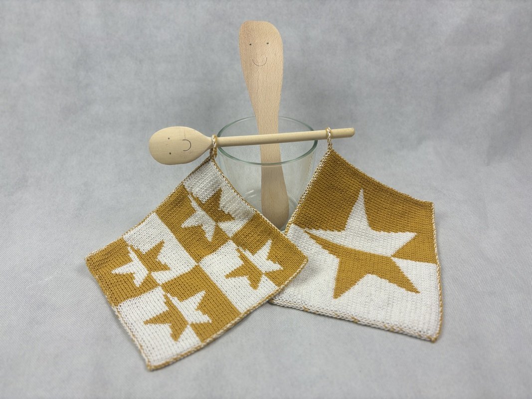 Egal ob für den Sternenkoch der Familie oder für die Jahreszeit der Sterne in der eigenen Küche, diese Topflappen kommen immer gut an. In Gold mit Weiss gearbeitet sind sie eine edle Zierde für jede Küche und ein schönes Kompliment für den Koch.