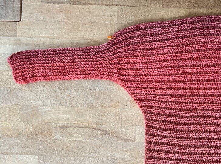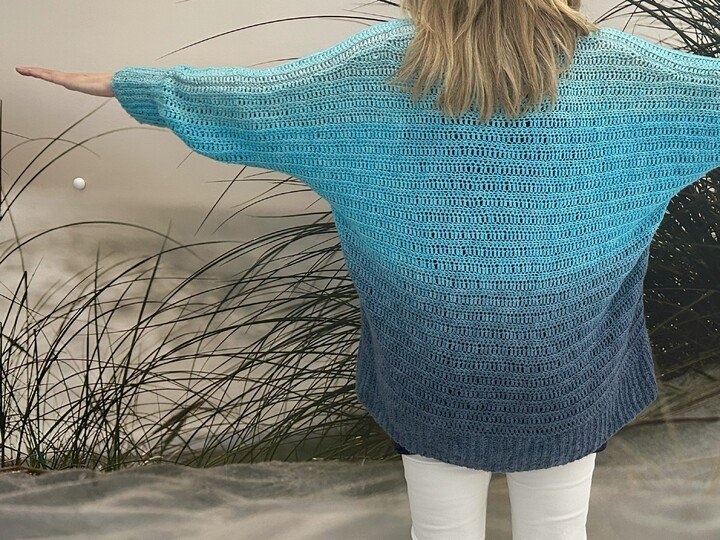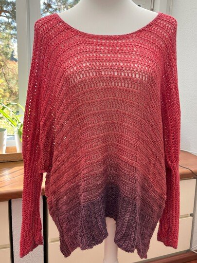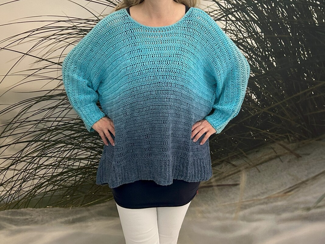 Kuschliger Oversize-Pullover mit Rundhalsausschnitt, der leicht nachgearbeitet werden kann und schnell fertig wird. Besonders schön wird der Pullover, wenn er mit einem Farbverlaufsgarn gehäkelt wird. Die Ärmel werden zusammen mit Vorder- und Rückenteil gehäkelt, so dass hier das Zusammennähen entfällt.
