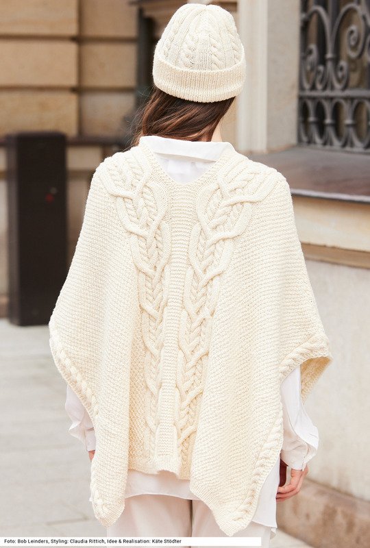 Als stilvolle Alternative zu Jacken ziehen Ponchos immer noch die Blicke auf sich. Designer auf der ganzen Welt interpretieren den südamerikanischen Poncho immer wieder auf neue Art und fügen moderne Elemente hinzu. Bestes Beispiel ist dieses Design, das mit verschlungenen Zopf-Strängen glänzt, welche den Rahmen für ein plastische Perlmuster bilden. Perfekte Ergänzung dazu: eine Mütze mit Umschlag. Für den Überblick bei dieser Musterpracht sorgen die übersichtlichen Strickschriften in der Anleitung. Tipp: Um die Mustereinteilung noch übersichtlicher zu machen, helfen Maschenmarkierer zwischen den einzelnen Mustern.