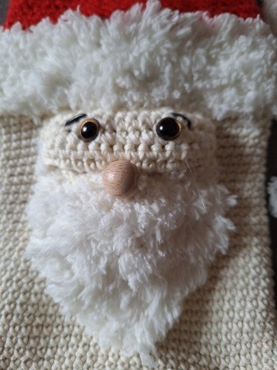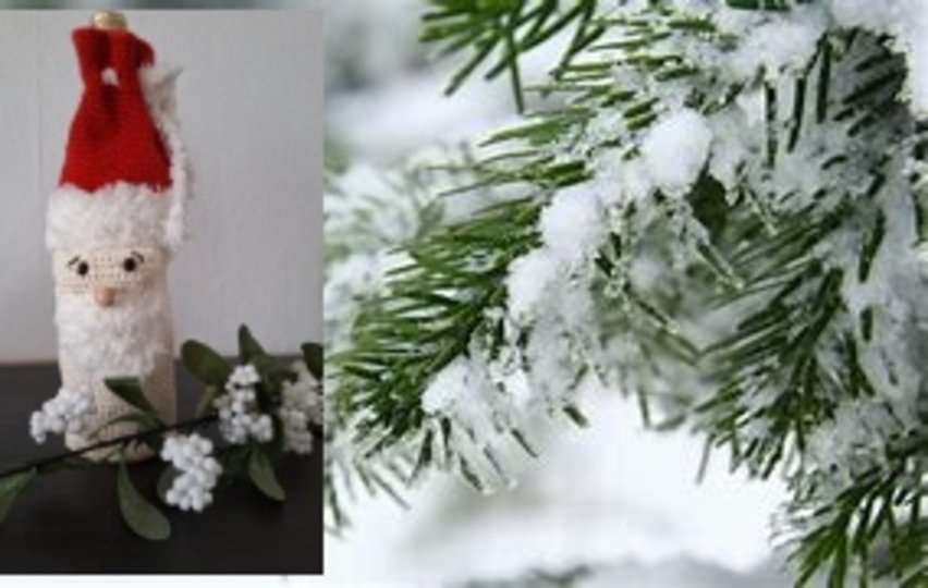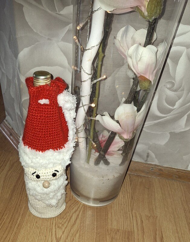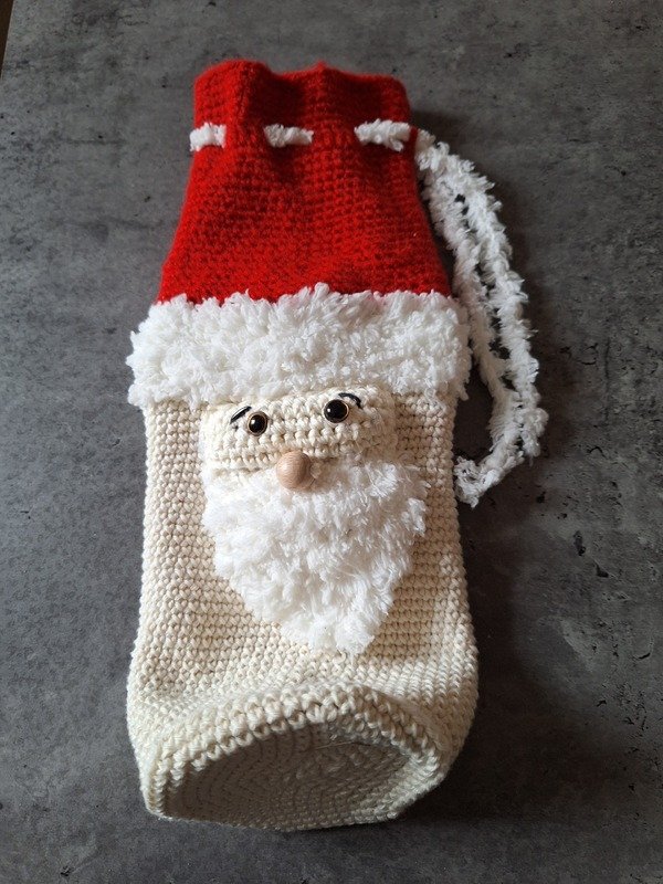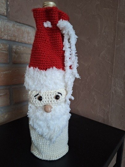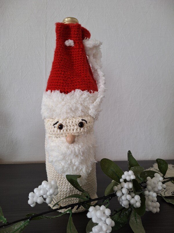Bei dieser Häkelanleitung handelt es sich um eine Flaschenhülle mit einem plastischen Weihnachtsmanngesicht.